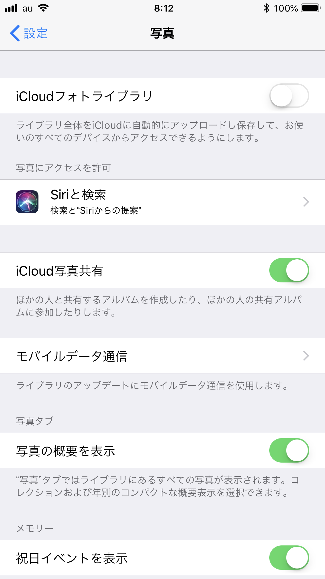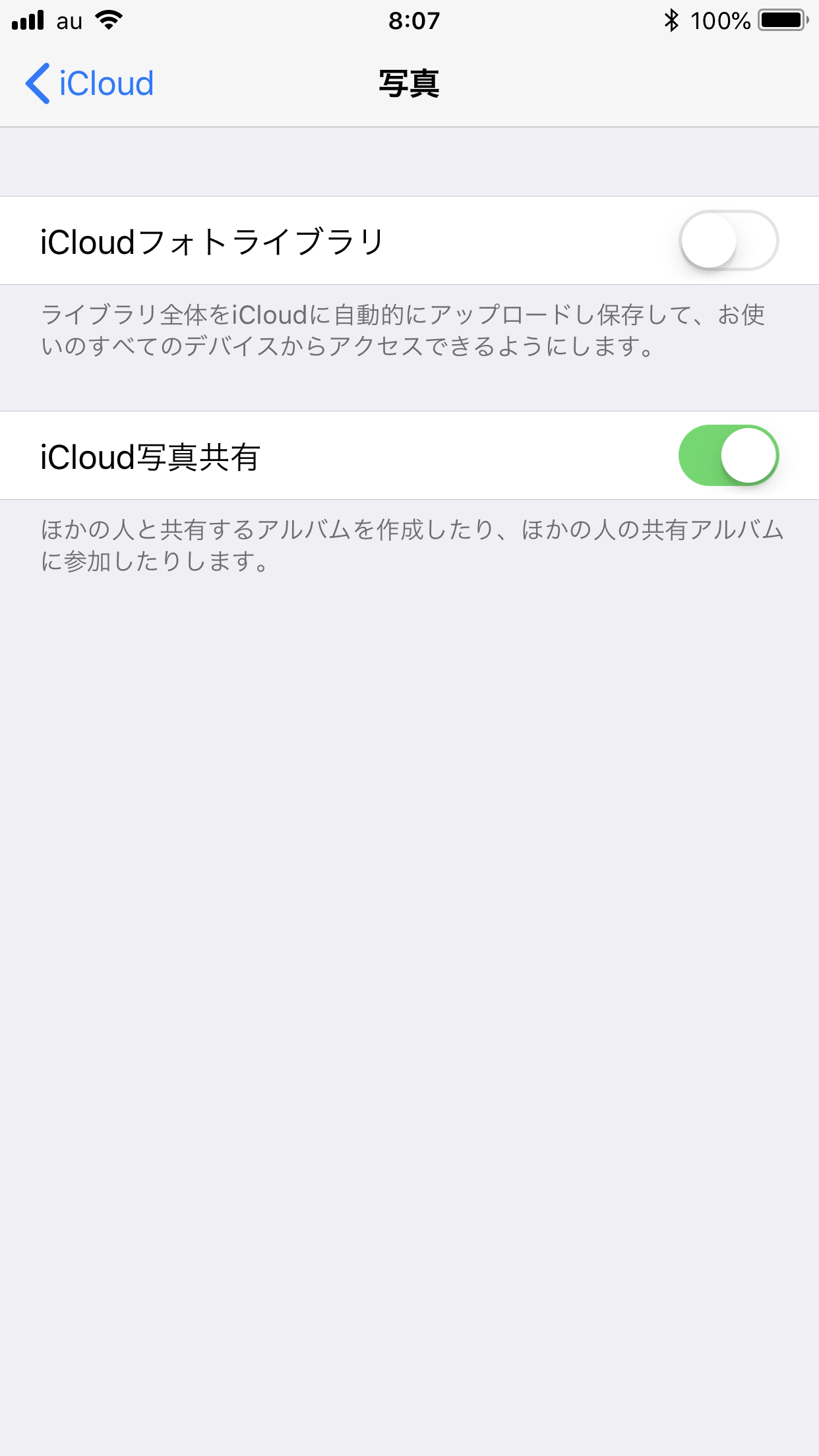 iCloudフォトライブラリがONになっている場合、マイフォトストリームの設定項目が消えますが、iCloudフォトライブラリをOFFにしてもマイフォトストリームの設定項目(スイッチ)が現れません。