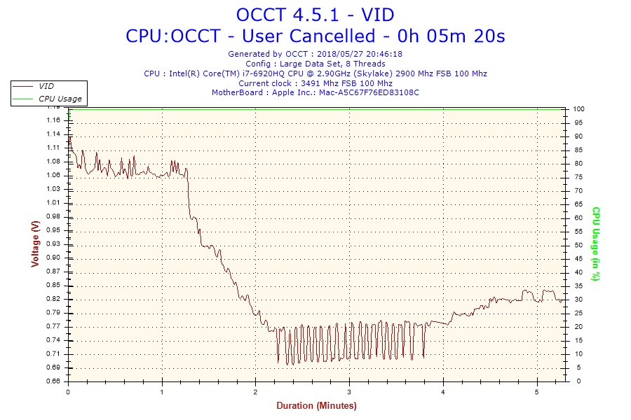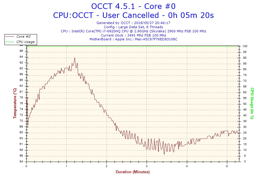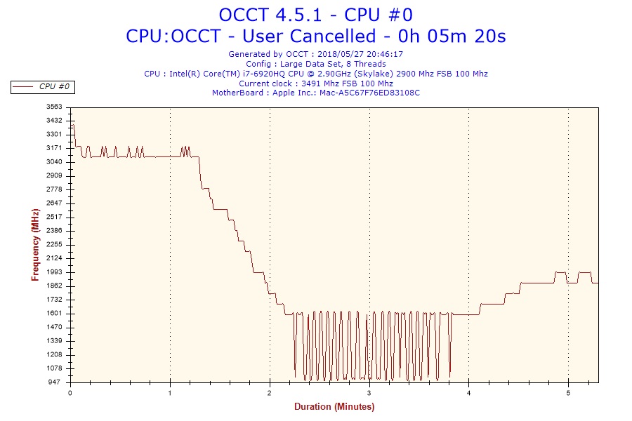 最初はブーストクロック3.2GHz周辺で動作し温度が90度に到達したあたりからクロックがと電圧が下がり始め最低で約900MHzほどまで下がります。その後徐々に上昇するものの1.5GHz前後から一切上がらずに、キーボード入力すら厳しいほど演算スピードが落ちます。