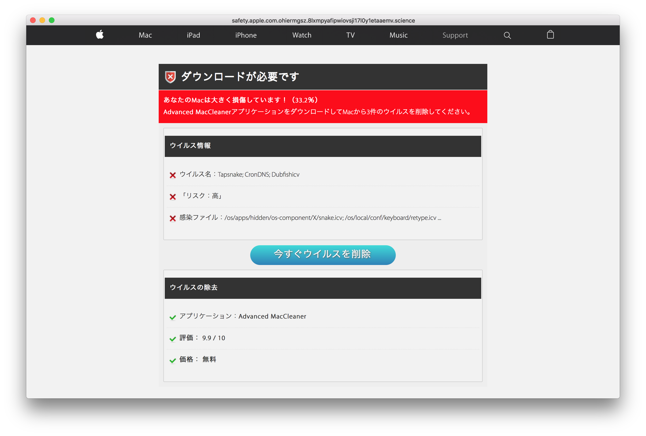 お使いのMacは3つのウイルスに感染しています。セキュリティチェックで2件のマルウェアと1件のフィッシングもしくはスパイウェアの痕跡が見つかりました。システムの損傷:28.1%-すぐに削除する必要があります!