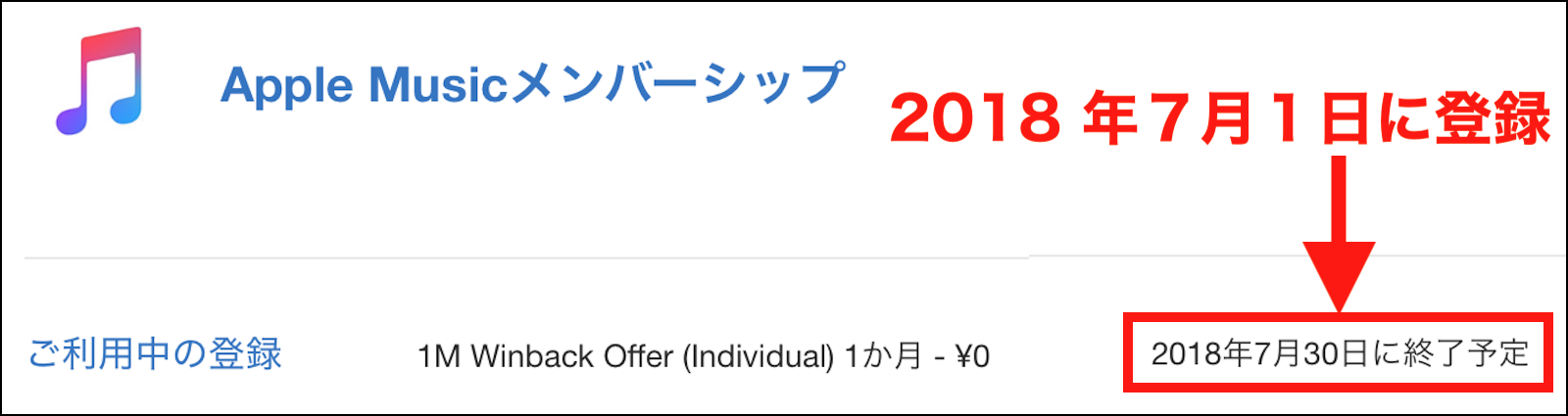 試しに本日(2018 年 7 月1日) Apple Music の1ヶ月無料トライアルに登録して見ましたが、下の画像の様に「2018 年 7 月 30 日に終了予定」と表示されています。