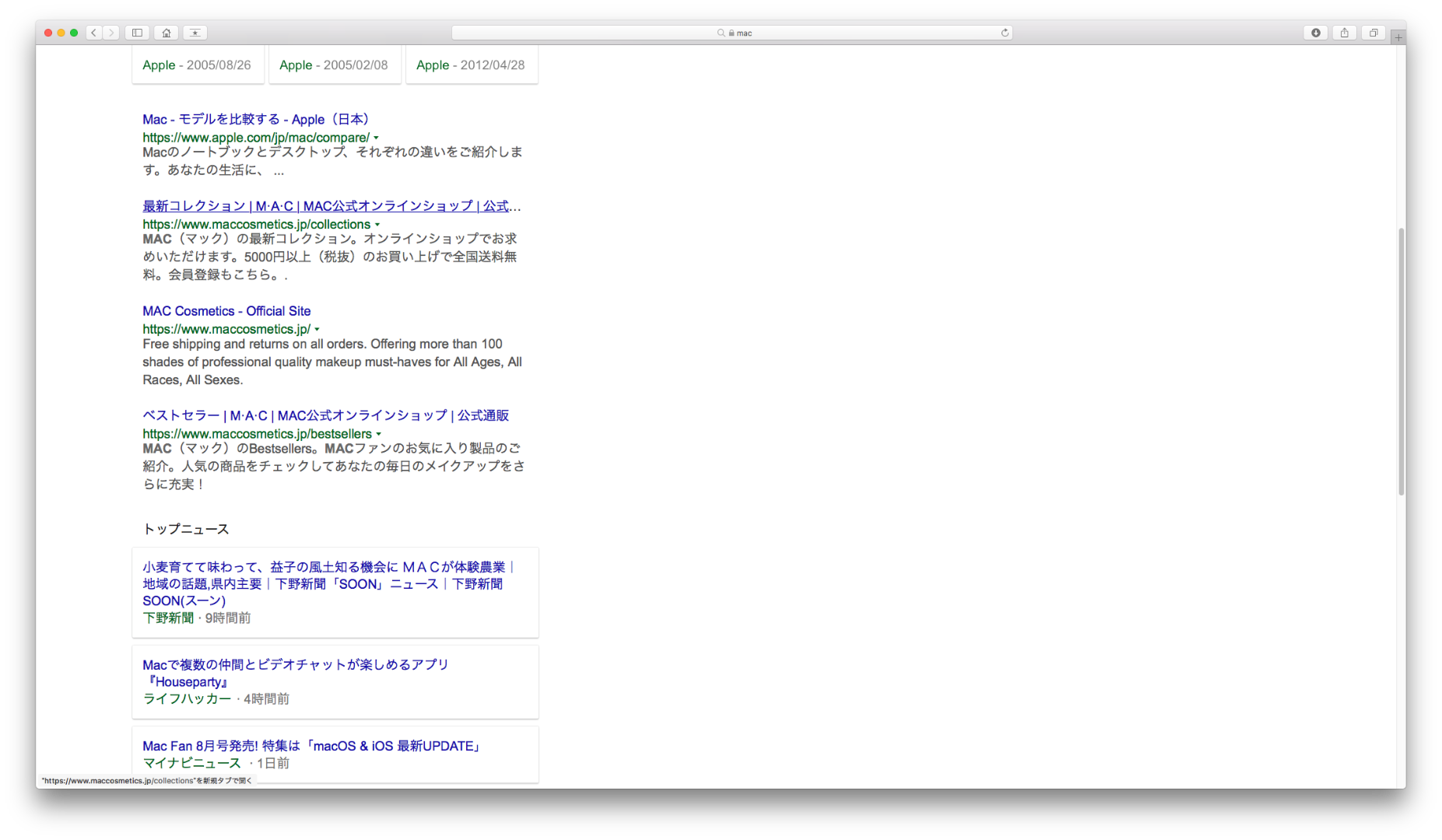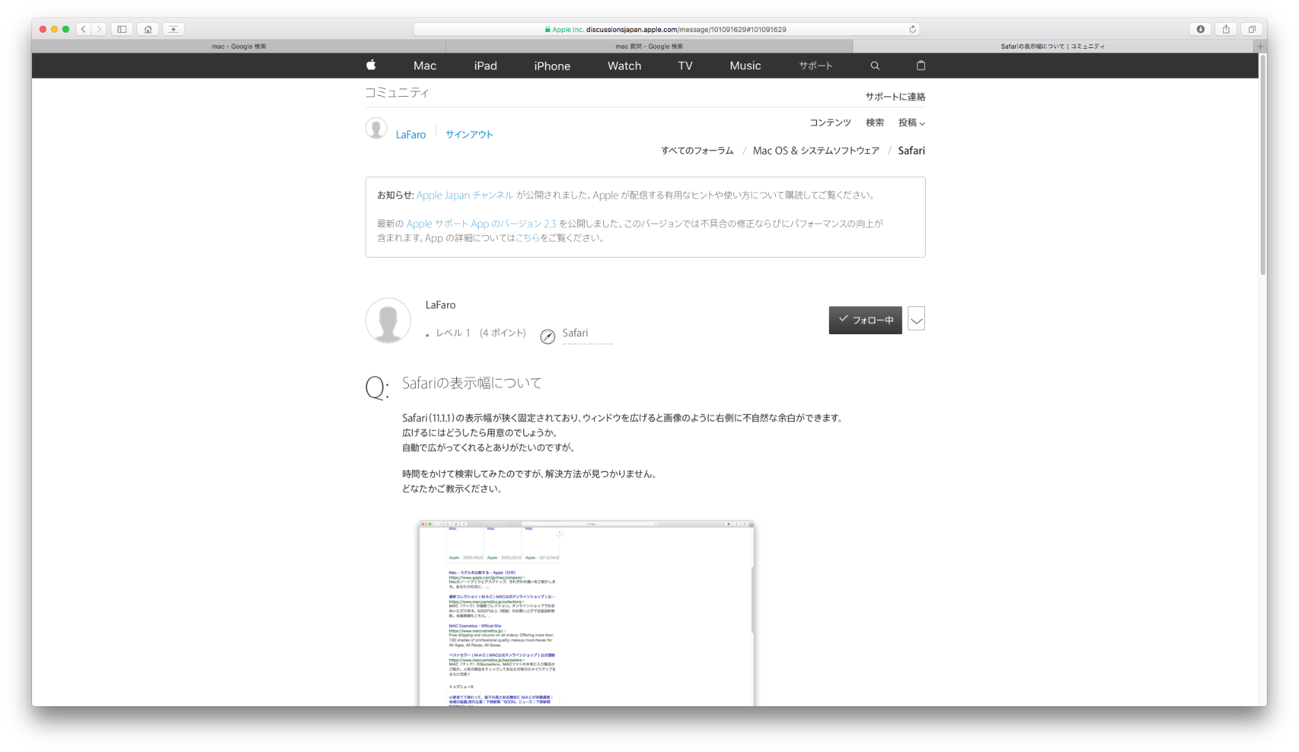 Safari(11.1.1)の表示幅が狭く固定されており、ウィンドウを広げると画像のように右側に不自然な余白ができます。
