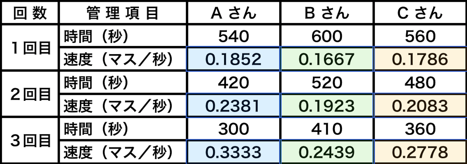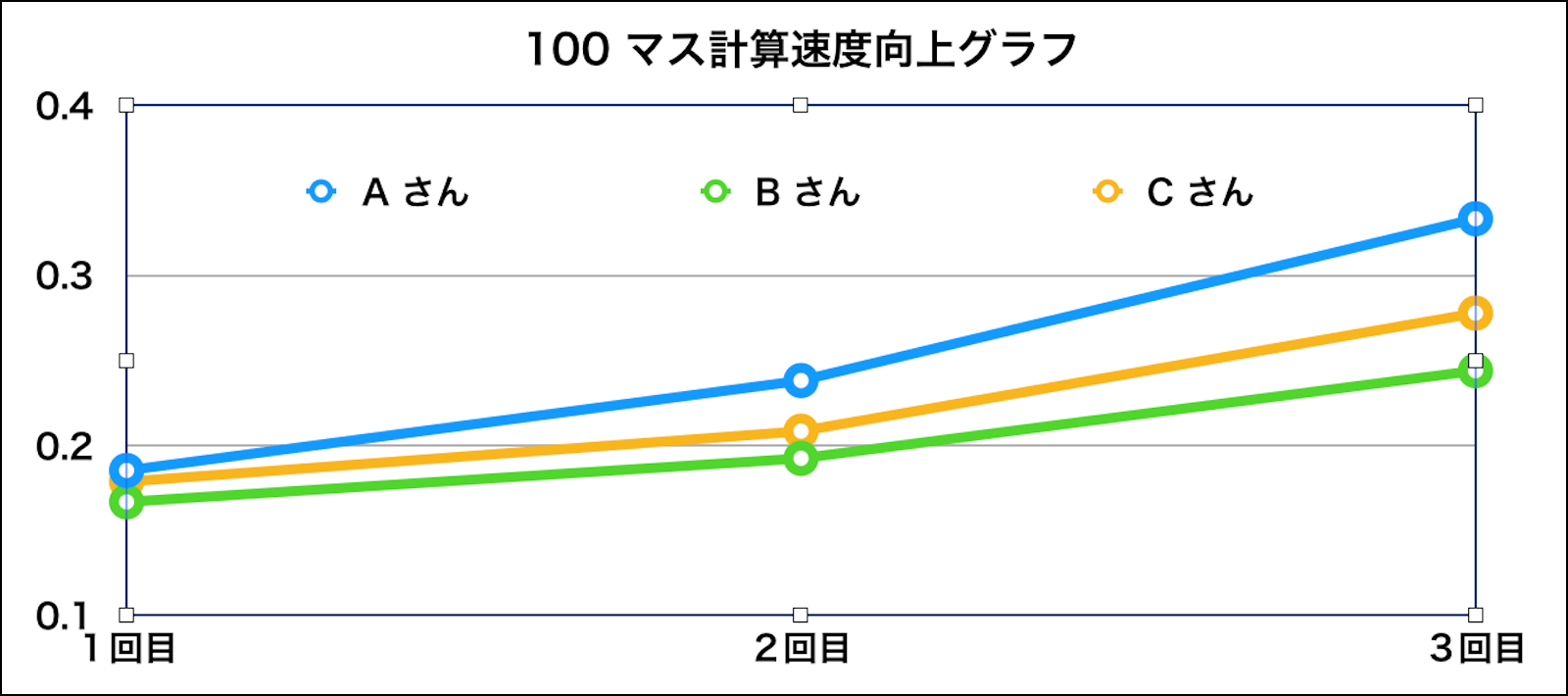 教え子に100マス計算を毎日させているのですが、その結果を(毎回100マス計算をするたびに徐々に終わるスピードが早くなっている事)グラフで表したいのですが。。例えばAさん:1回目9分 二回目 7分 三回目5分 のように表を作りグラフにしたいのですが、この数字でグラフを作るとy軸で9分がMaxになり、棒グラフだと徐々に棒線が下がる事になってしまい、100マス計算のスピードが上がっていることが証明できません。どなたか知恵を貸していただきたいのですが。宜しくお願い致します。