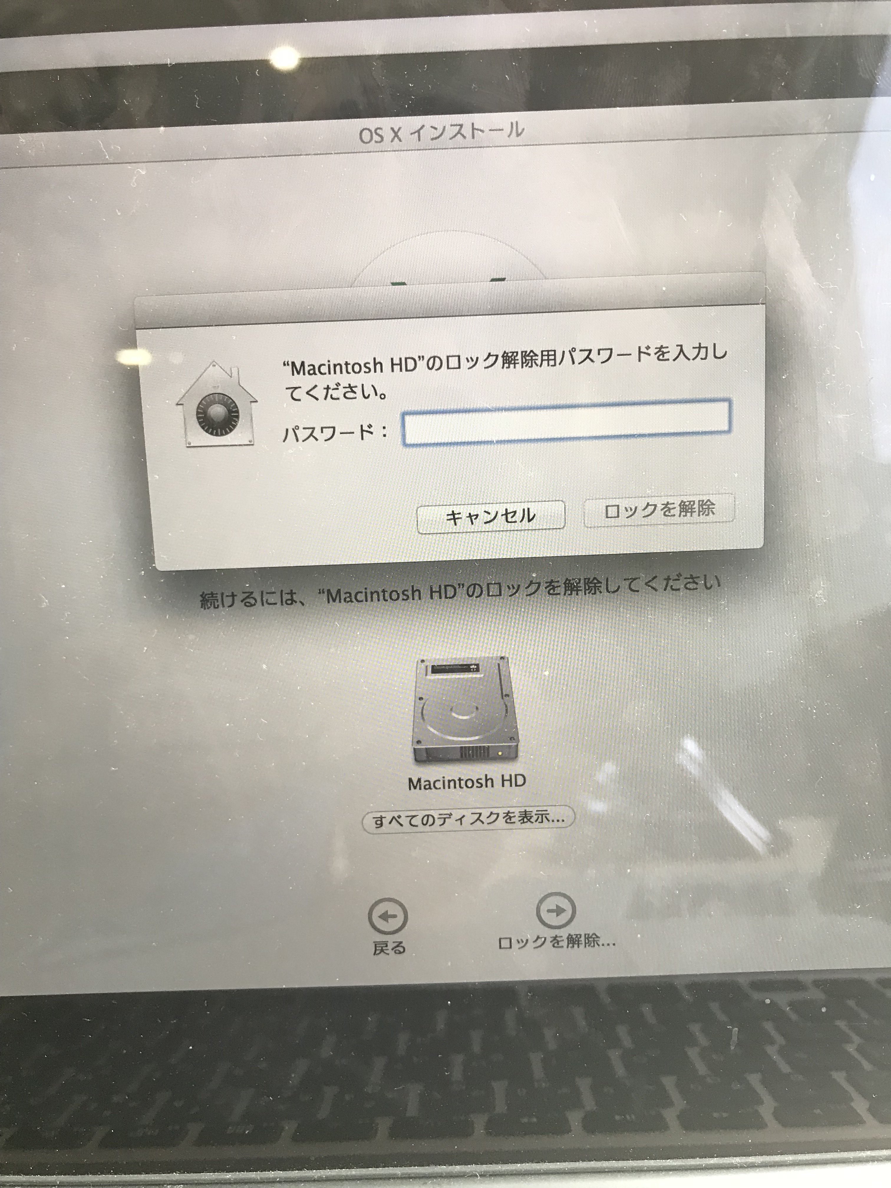 Macintosh HDのロック解除用パスワードを入力して下さいとでます。。