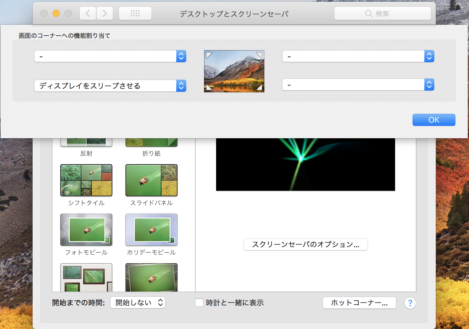 実はこちらで確認しようとしたのですが、ホットコーナーがうまく動作しませんでした。これまで使ったことがないのでポイントする場所が悪いのかと思ったのですが、右下を「デスクトップ」に設定したらすぐに反応したので、ちょっとわけがわかりません(左下、右下どちらも反応しませんでした)。それで省エネルギー設定で自然にオフになるまで待って、音楽が止まらないことを確認しました。