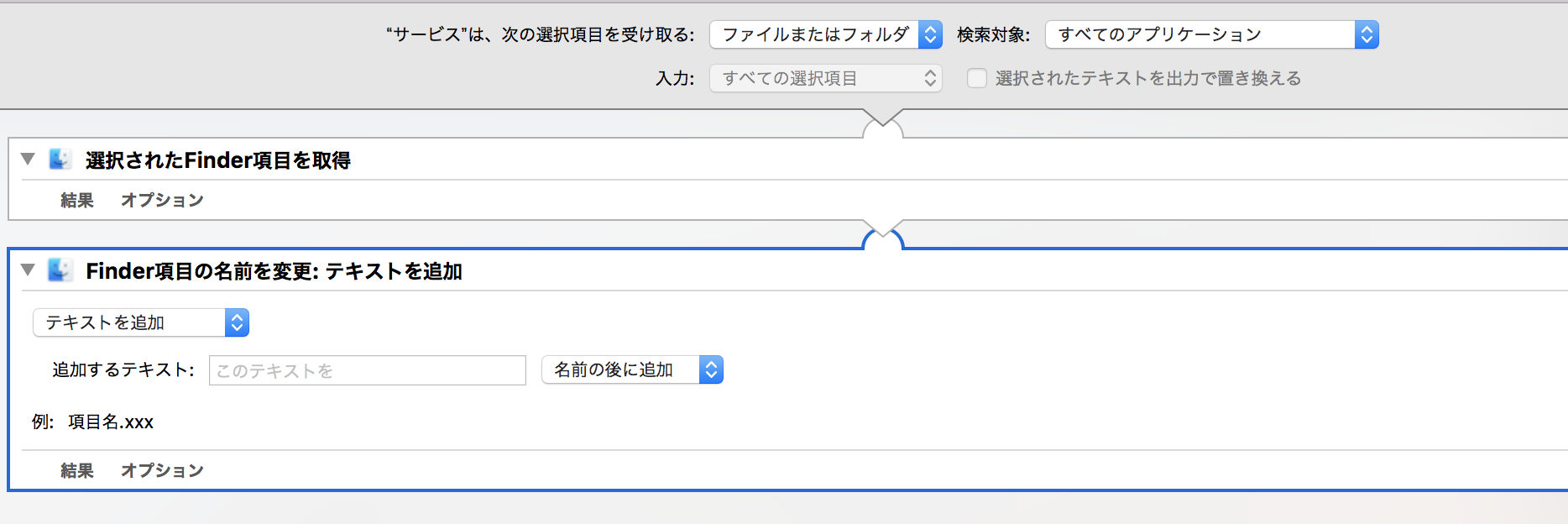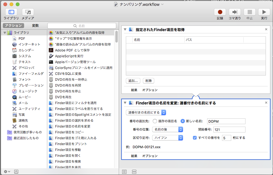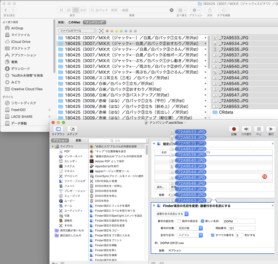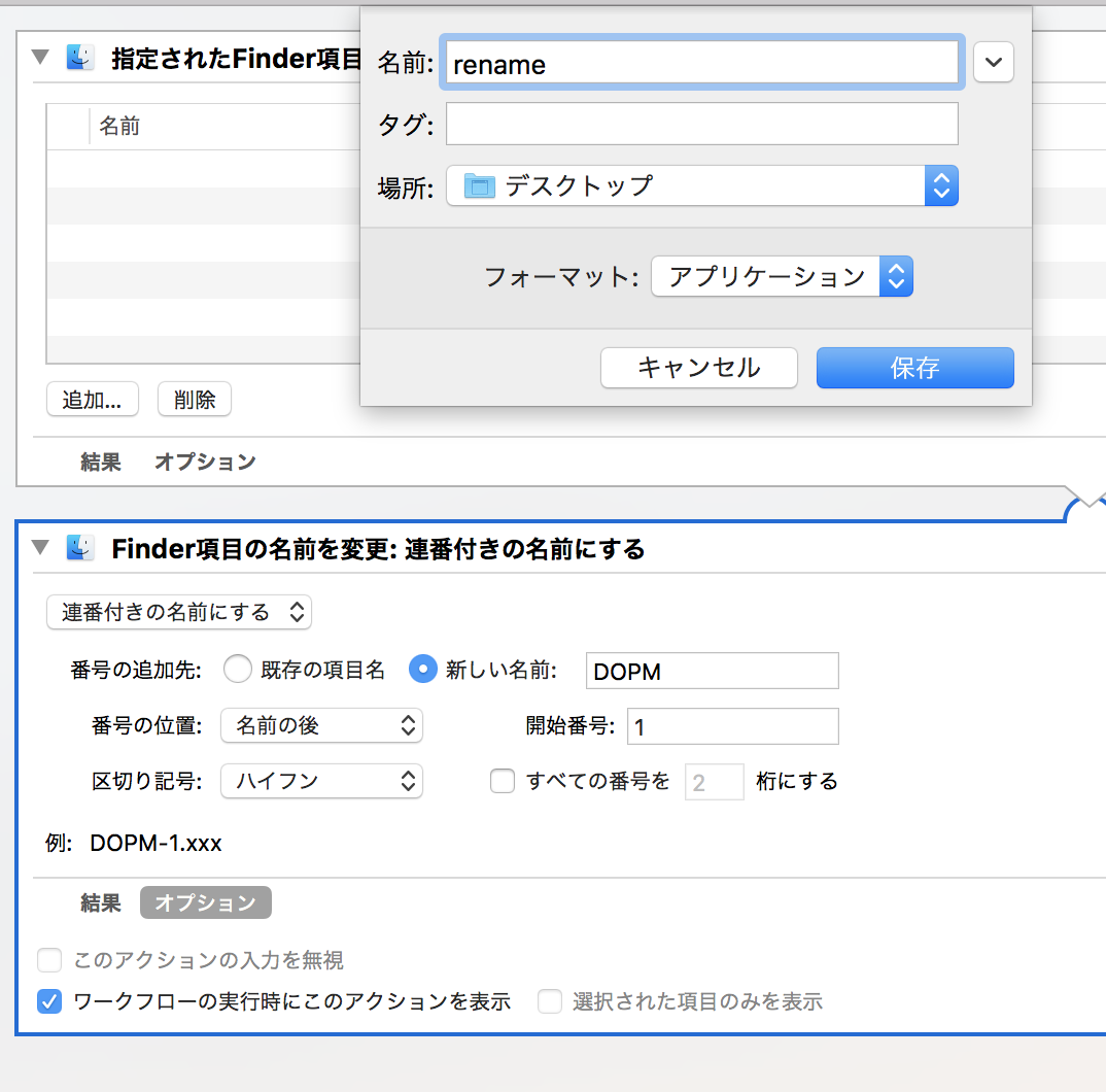 4)一方で、『Finder項目の名前を変更』のアクションで固まるようであれば、『シェルスクリプトを実行』アクションや、『AppleScriptを実行』アクションなどに変更して見ることも出来そうです。
