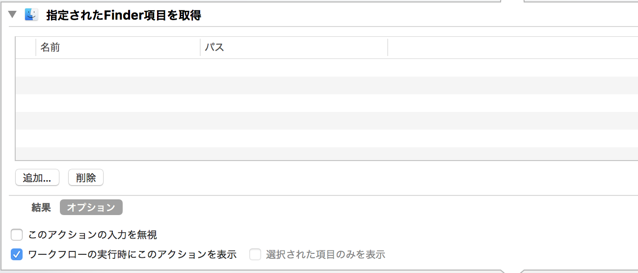 その際、オプションをクリックして、ワークフローの実行時にこのアクションを表示にチェックを入れます。