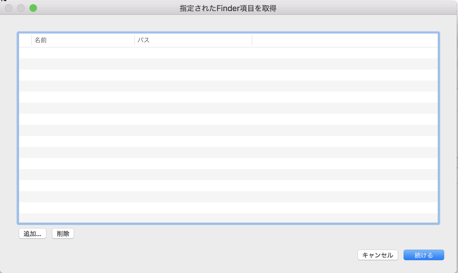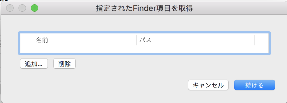 3)始めのアクションで固まるようであれば、『指定されたFinder項目を取得』の代わりに、2つの『Finder項目の選択を求める』アクション(『複数選択を許可』の項目にチェックを入れておく)に変更して見ることもできそうです。