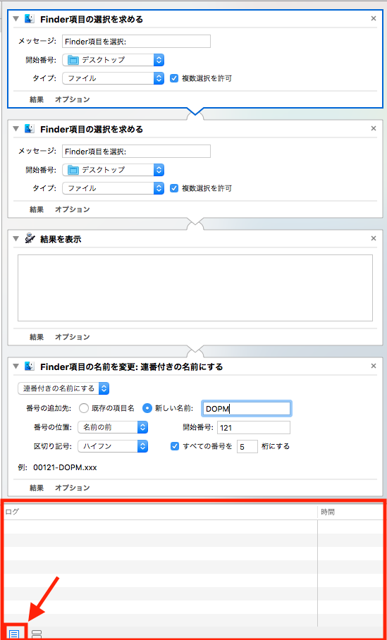 2)ご使用のMacが固まった時に、ログを見ると、2つのアクション(『指定されたFinder項目を取得』、『Finder項目の名前を変更』)の内、どちらのアクションで固まるのかを特定できそうです。
