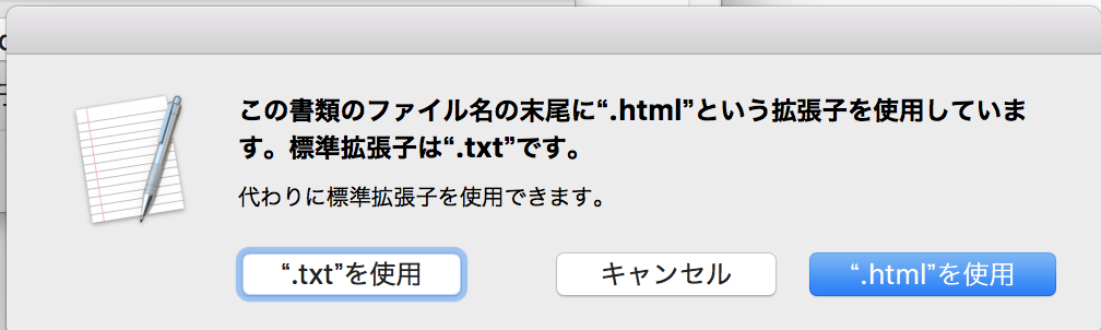 テキストエディットの環境設定で"txtを追加”のチェックボックスを外していても、保存の際に「〇〇.html.txt」と付いてきてしまいます。どうすればhtmlとして保存できるようになるでしょうか