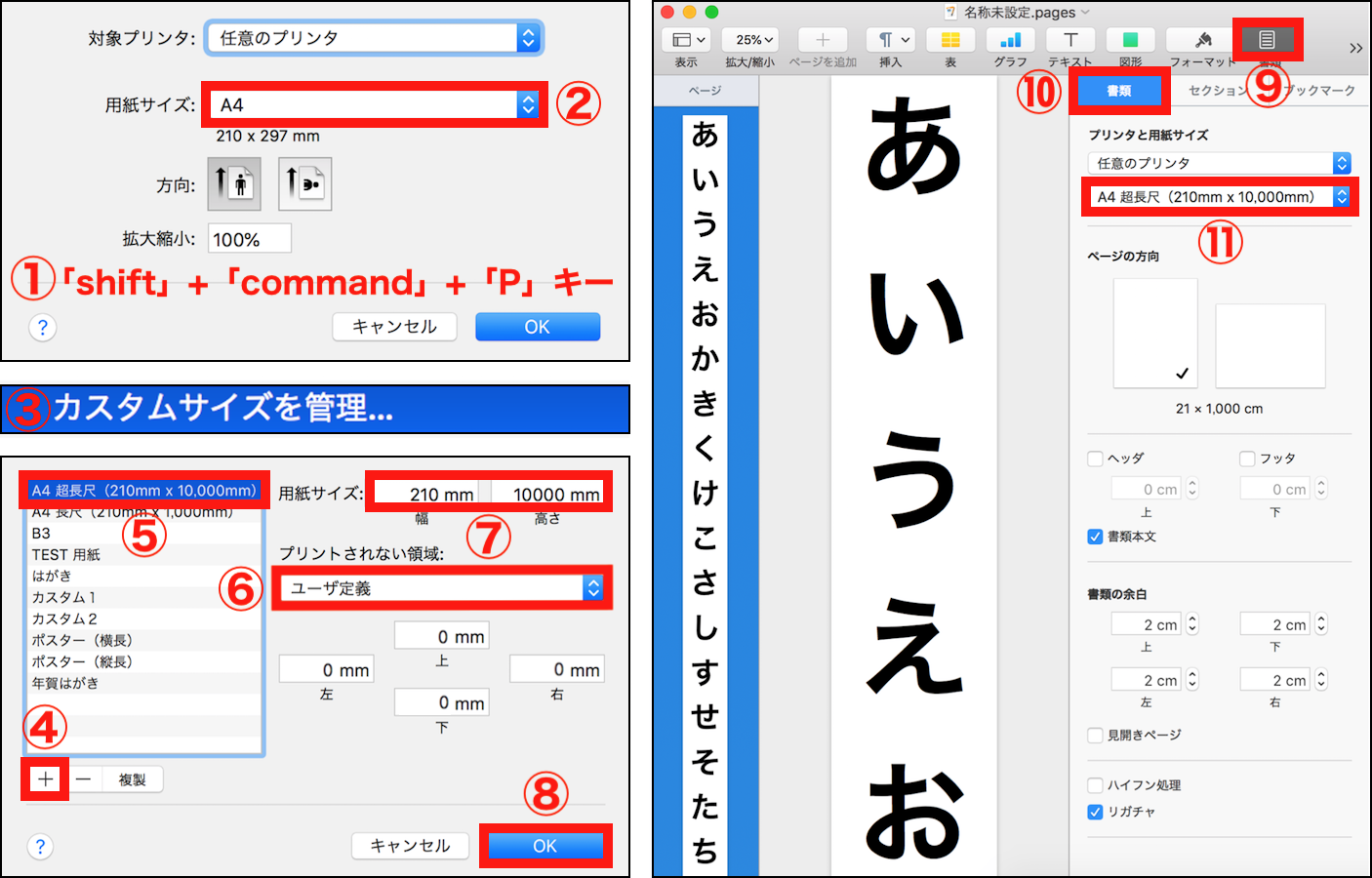 もし、プリントアウトを必要としない書類(閲覧・記録用等)であれば、下記の操作でカスタムサイズの用紙を設定する事で、下の画像の様にページを跨ぐ事無く書類を作成する事が出来ます。