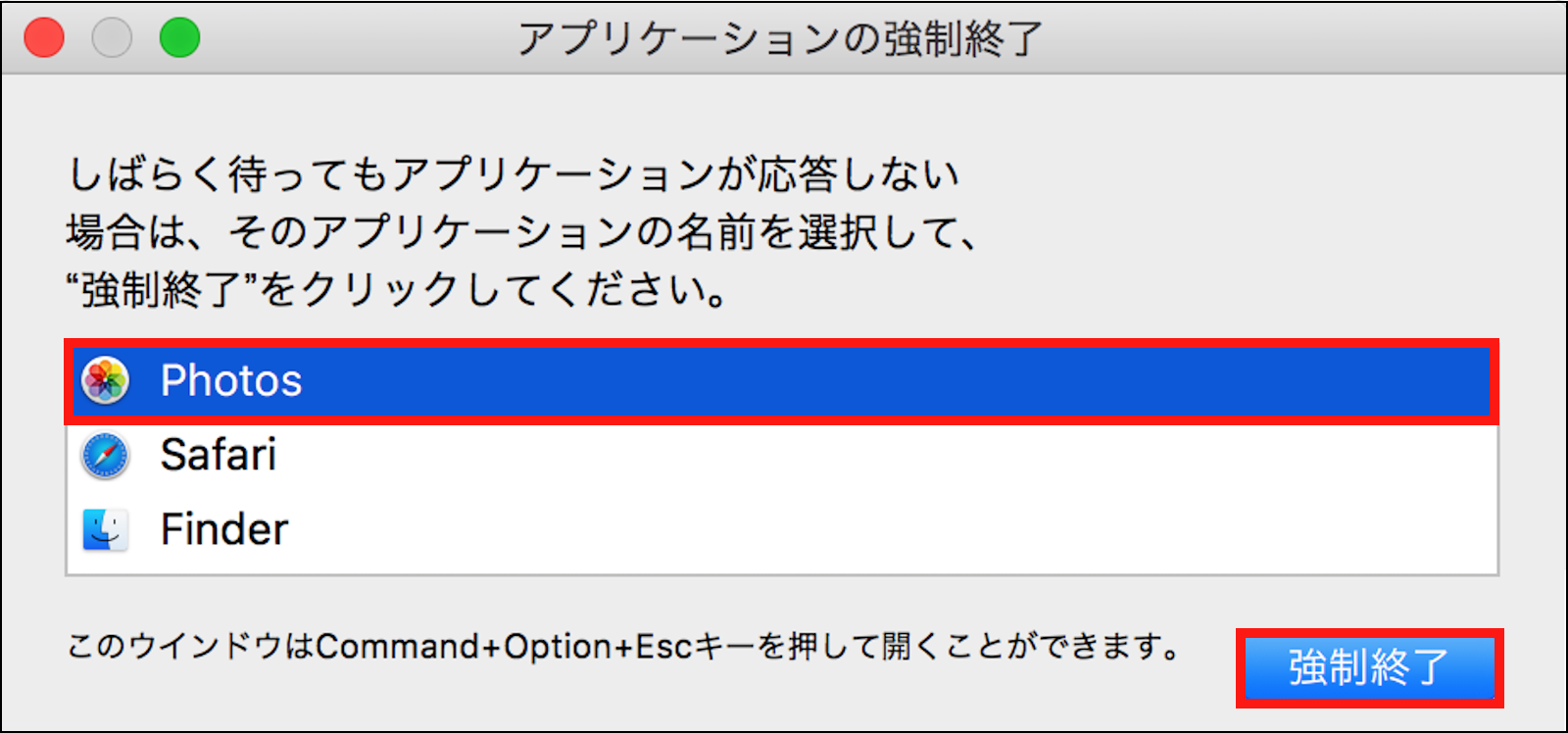 いつまでも「ライブラリのアップデート中 16%」のまま全く進展しない場合は、おそらく停止していると思われますので、「option」+「command」+「esc」キーで「アプリケーションの強制終了」ウインドウを表示させ、一旦「Photos」を強制終了してから再度「写真.app」を起動して見て下さい。
