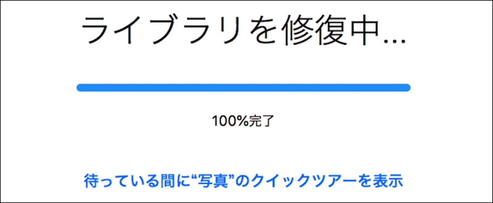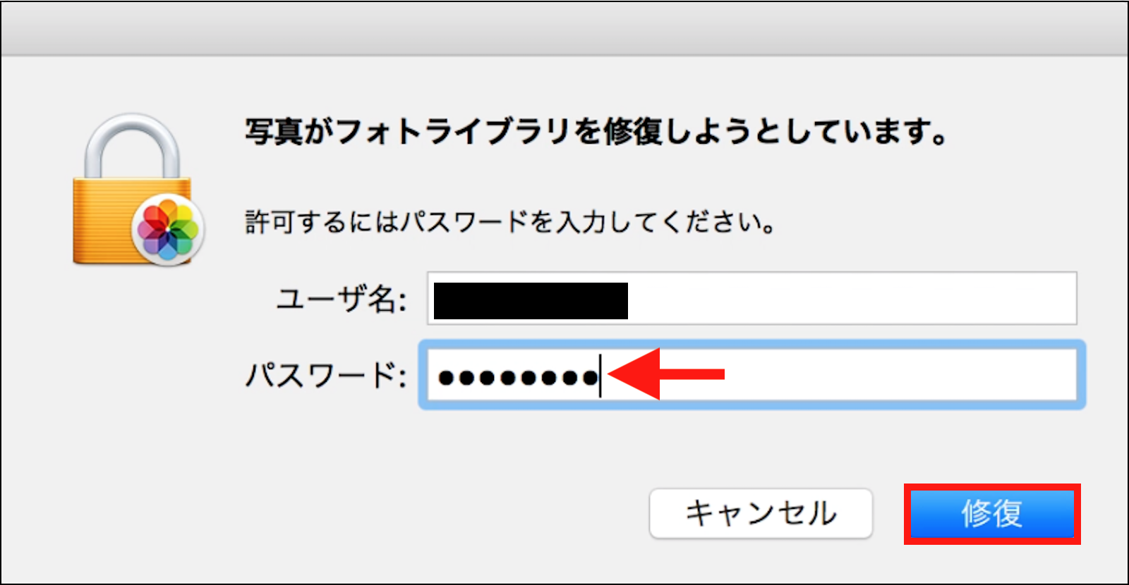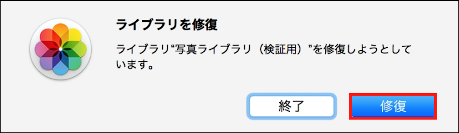 再度「写真.app」を起動しても「ライブラリのアップデート中 16%」のまま全く進展しない場合は、再度「Photos」を強制終了して、「option」+「command」キーを押しながら「写真.app」を起動すると、下の画像の様なダイアログが表示されますので、「修復」ボタンをクリックして下さい。