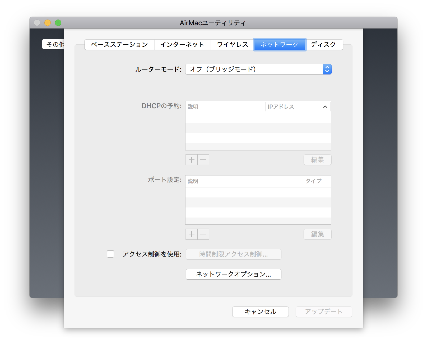 AirMacユーティリティのインターネットネットワークにある「ルーターモード」の設定は「DHCP」ではなく「オフ(ブリッジモード)」にしてください。