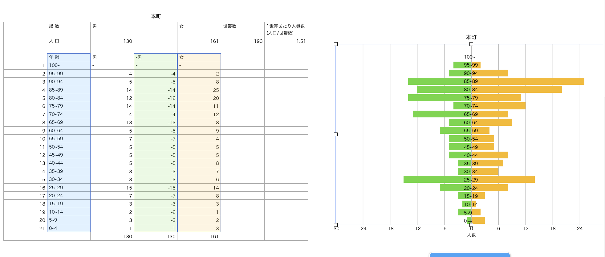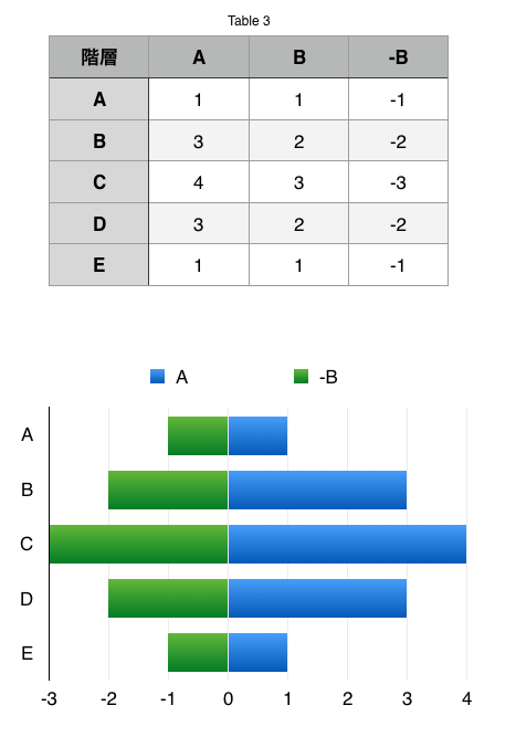 ユーザのユーザプロフィール: T22T T22T ユーザレベル: レベル 8 38,091 ポイント 2018/08/06 16:18 ADbari への返信 性別の一方をマイナスの値にして、グラフを作成するというのはどうでしょうか(下図)? 但し、横軸のラベルの半分がマイナスの値になってしまうので、ラベルを非表示にして、独自に作成したものを使う必要がありそうです。 返信 リンク