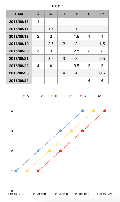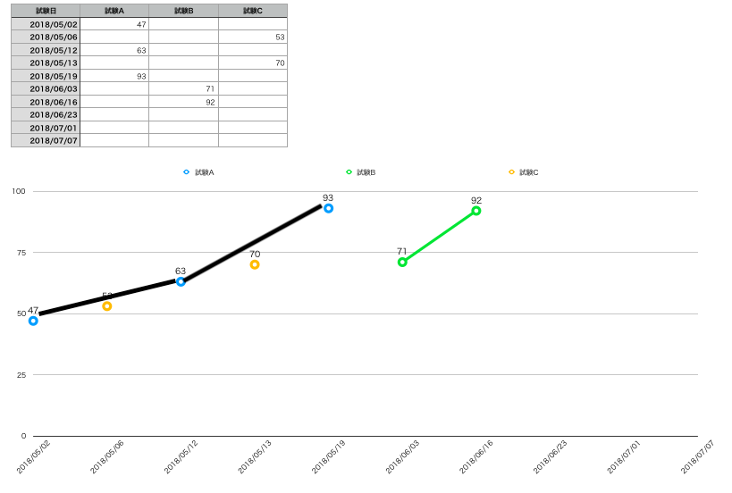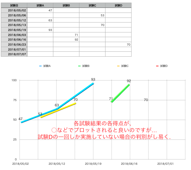 なので、Numbers.appでそのグラフを作成するには、少し方法を変える必要がありそうです。 例えば、空白のセルの値を補完する様な系列を追加して、直線で結びます(下図)。 補完の方法は関数やAppleScriptを使えば、自動的に可能かもしれません。