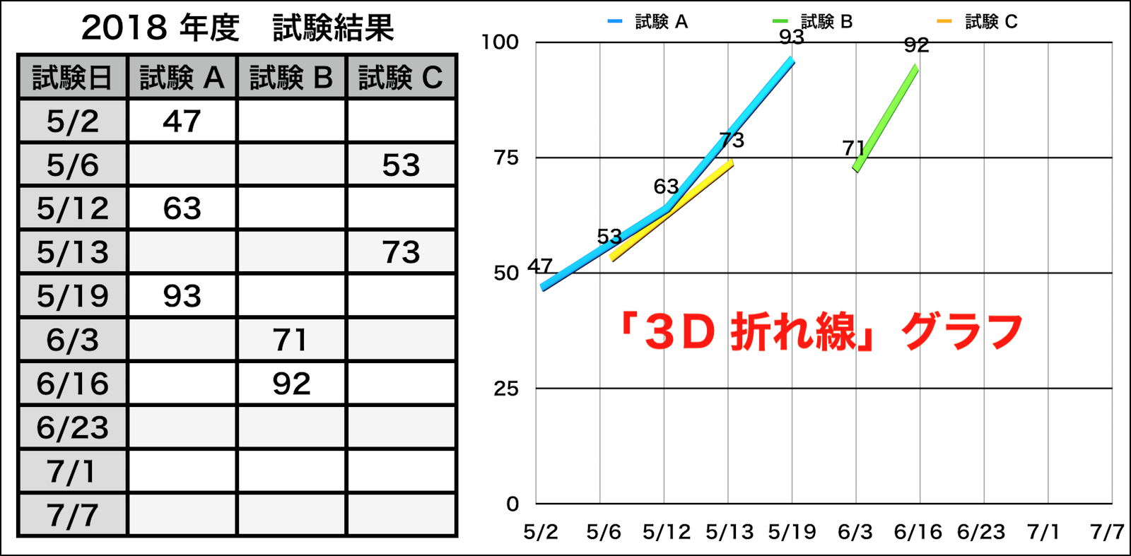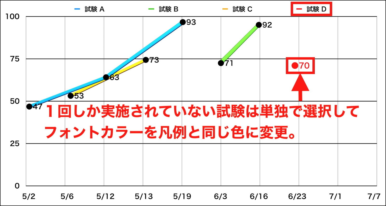 1回しか実施されていない試験は単独で選択して、フォントカラーを「凡例」と同じ色に変更して下さい。