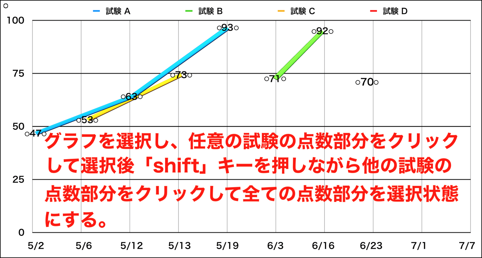まず、グラフを選択し、任意の試験の点数部分をクリックして選択後、「shift」キーを押しながら他の試験の点数部分をクリックして、下の画像の様に全ての点数部分を選択状態にします。