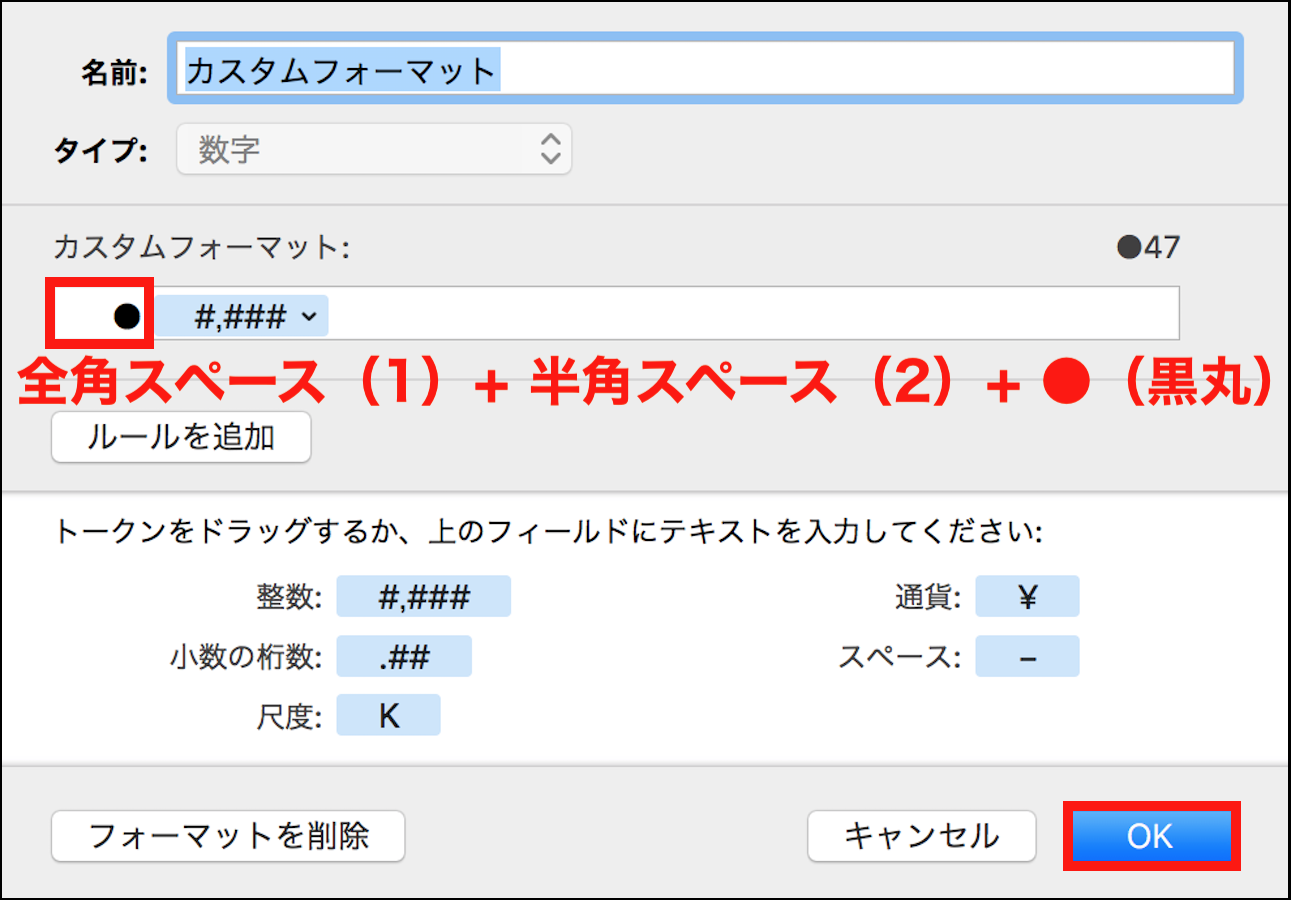 「フォーマット」インスペクタ >「数値ラベル」タブ >「数値ラベル」>「場所」を「中央」に設定し、「数値ラベル」の選択メニューから「カスタムフォーマットを作成」を選択すると表示される設定パネルで、下の画像の様に「カスタムフォーマット:」の入力欄の「整数(#,###)」トークンの前に、「全角スペース(1)」+「半角スペース(2)」+「●(黒丸)」を入力して、「OK」ボタンをクリックして下さい。