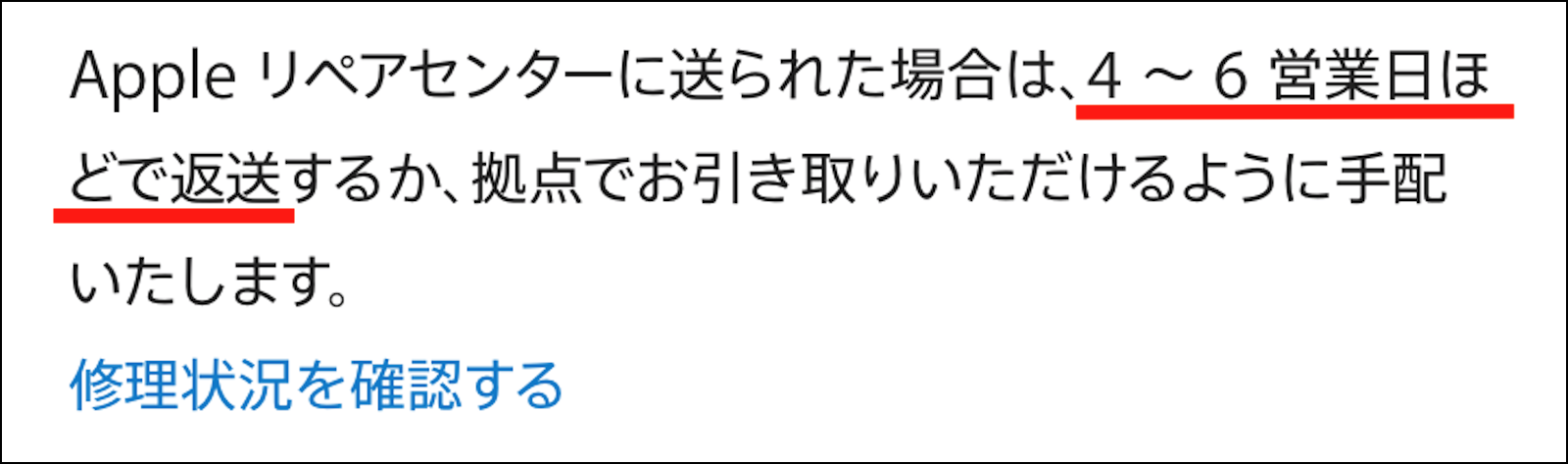 公式には、iPhone の「配送修理」を行なった場合は、「4〜6営業日ほどで返送」と言う事になっています。