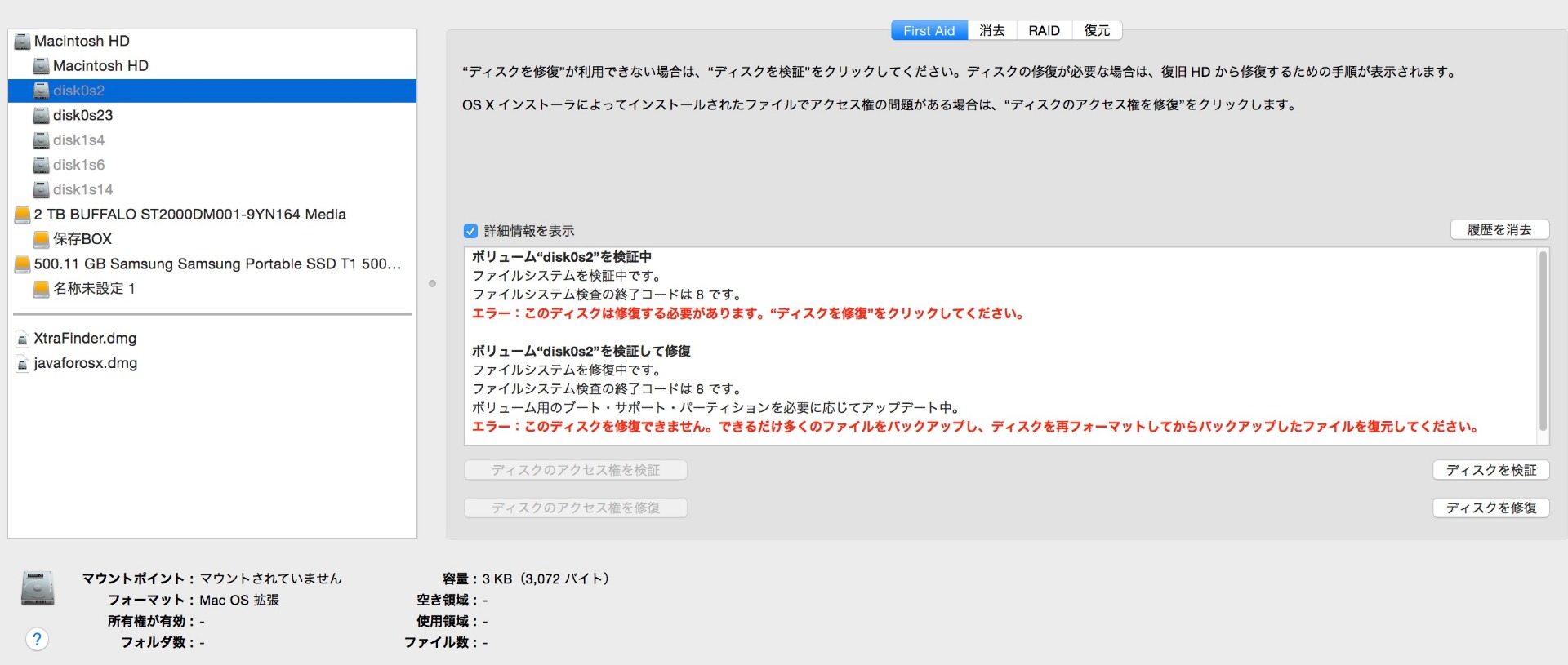 ・「ディスクを検証」を実行したところdisk0s2がエラーを吐き、その後「ディスクを修復」を実行したところ、↓のような画面になりお手上げ状態に…
