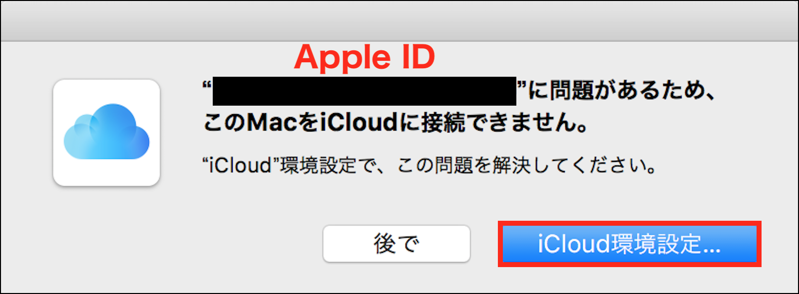 Mac を起動してログインすると、下の画像の様なダイアログが表示され、「iCloud 環境設定」ボタンをクリックすると、