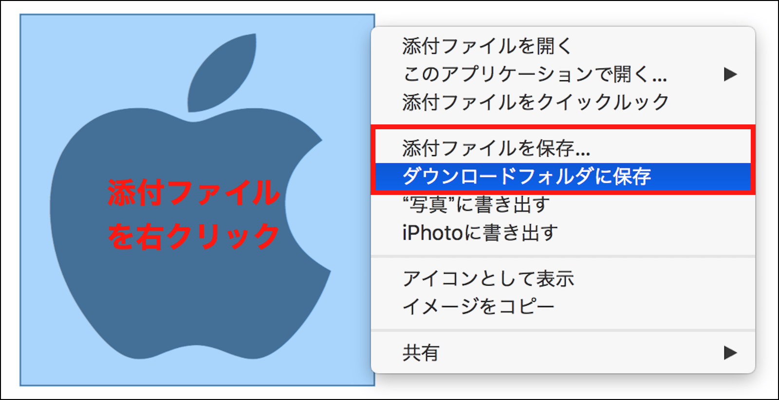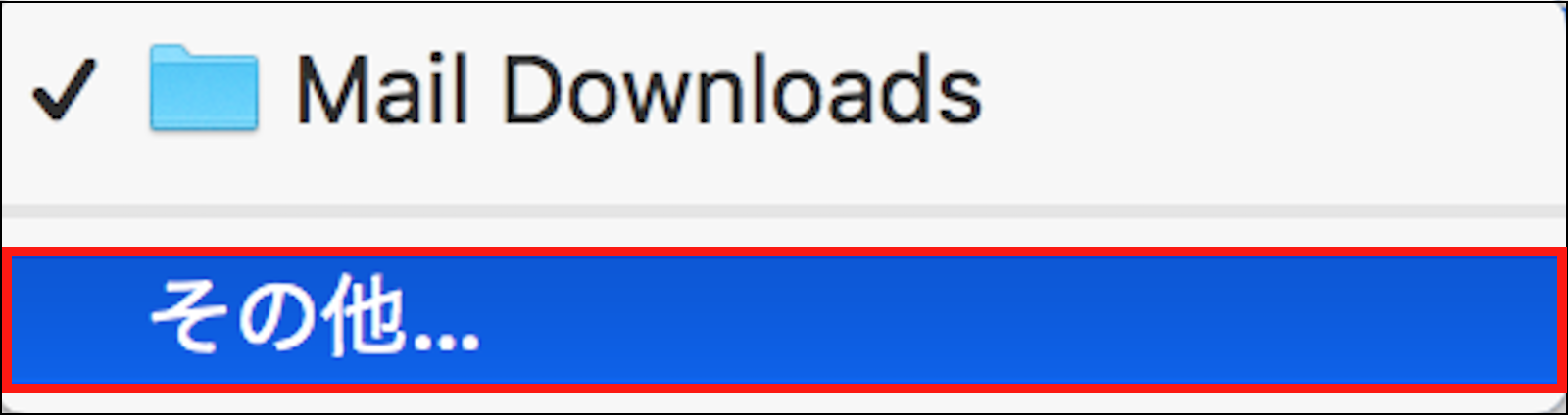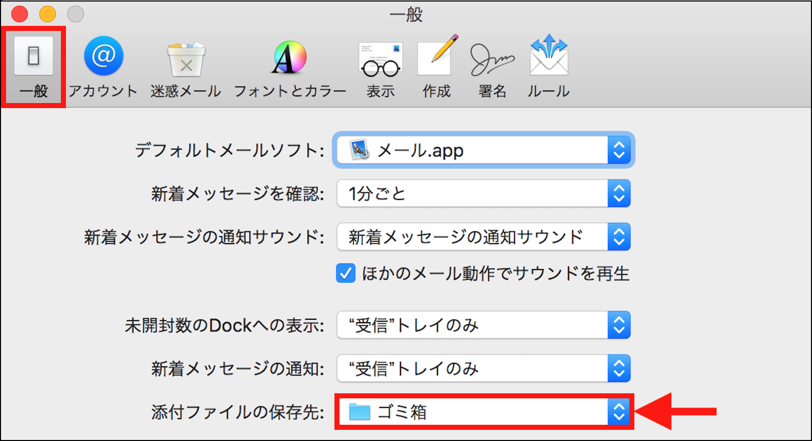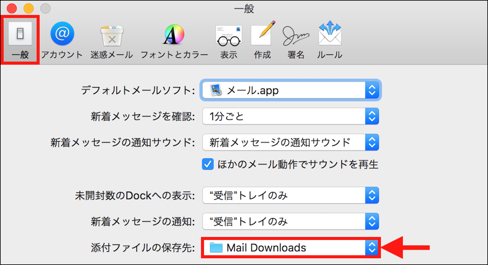 「メール」メニュー >「環境設定」>「一般」タブ >「添付ファイルの保存先:」の選択メニューをクリック。