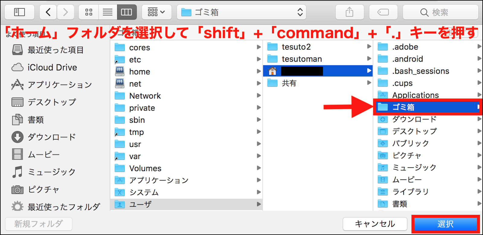 表示される「添付ファイルの保存先」選択ウインドウで、「ホーム」フォルダを選択して「shift」+「command」+「.(ピリオド)」キーを押すと、下の画像の様に通常非表示になっているフォルダが表示されますので、「ゴミ箱」フォルダを選択して「選択」ボタンをクリックして下さい。