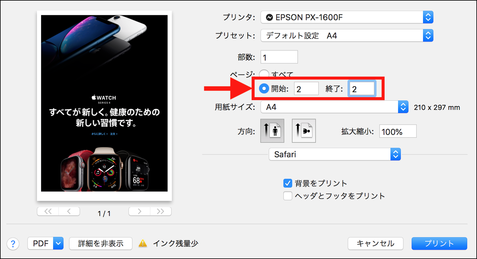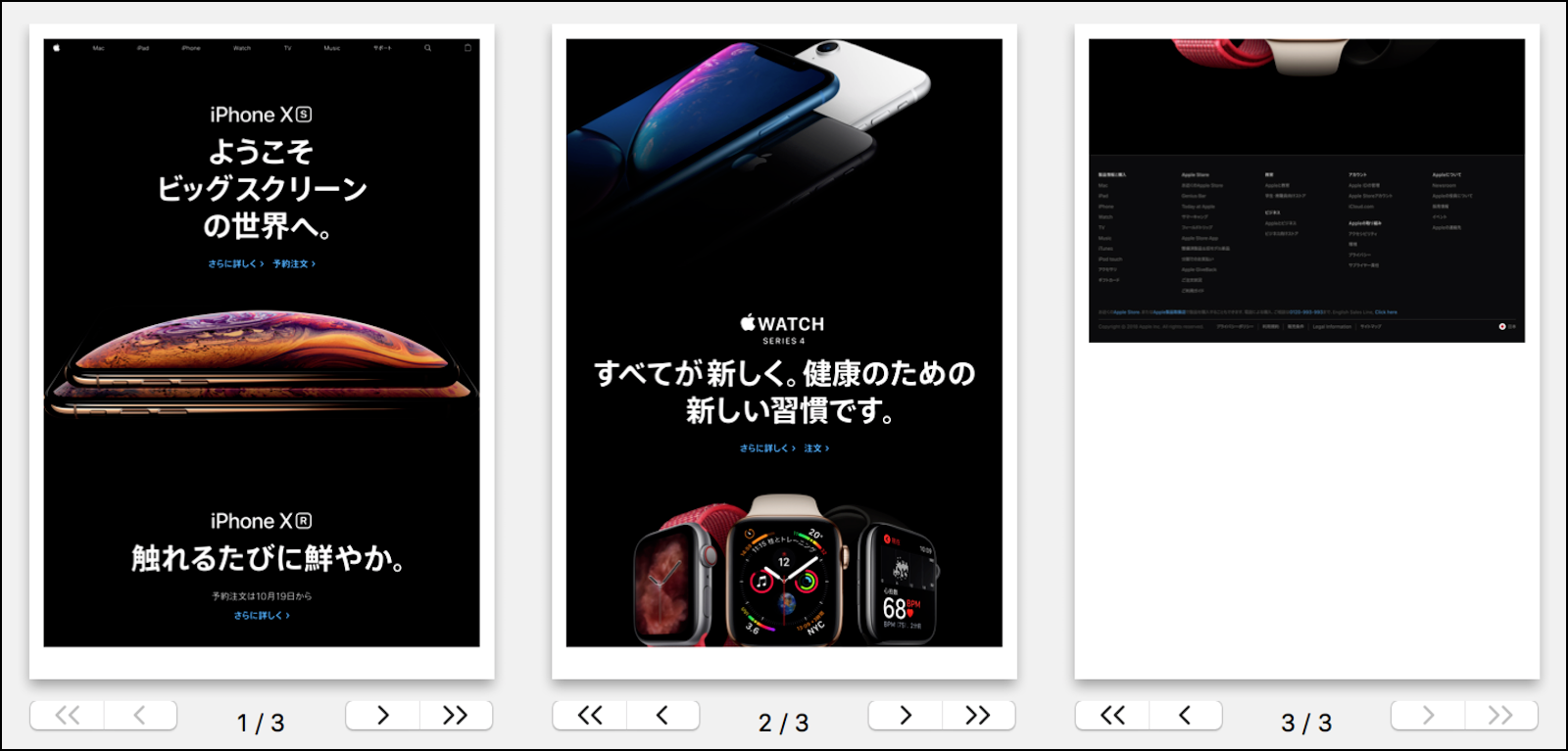 「Web ページの任意の部分」と言うのが良く分からないのですが、例えば Apple(日本)の Web ページを印刷しようとすると、下の画像の様に3枚程度(A4 の場合)になると思いますが、