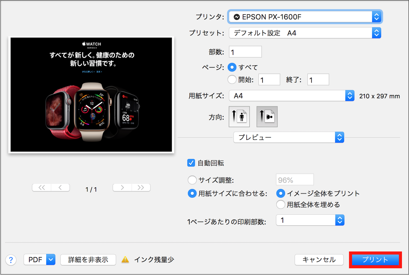 (印刷したい部分がウインドウ内に収まらない場合は、「command」+「-」キー等で縮小表示して下さい)