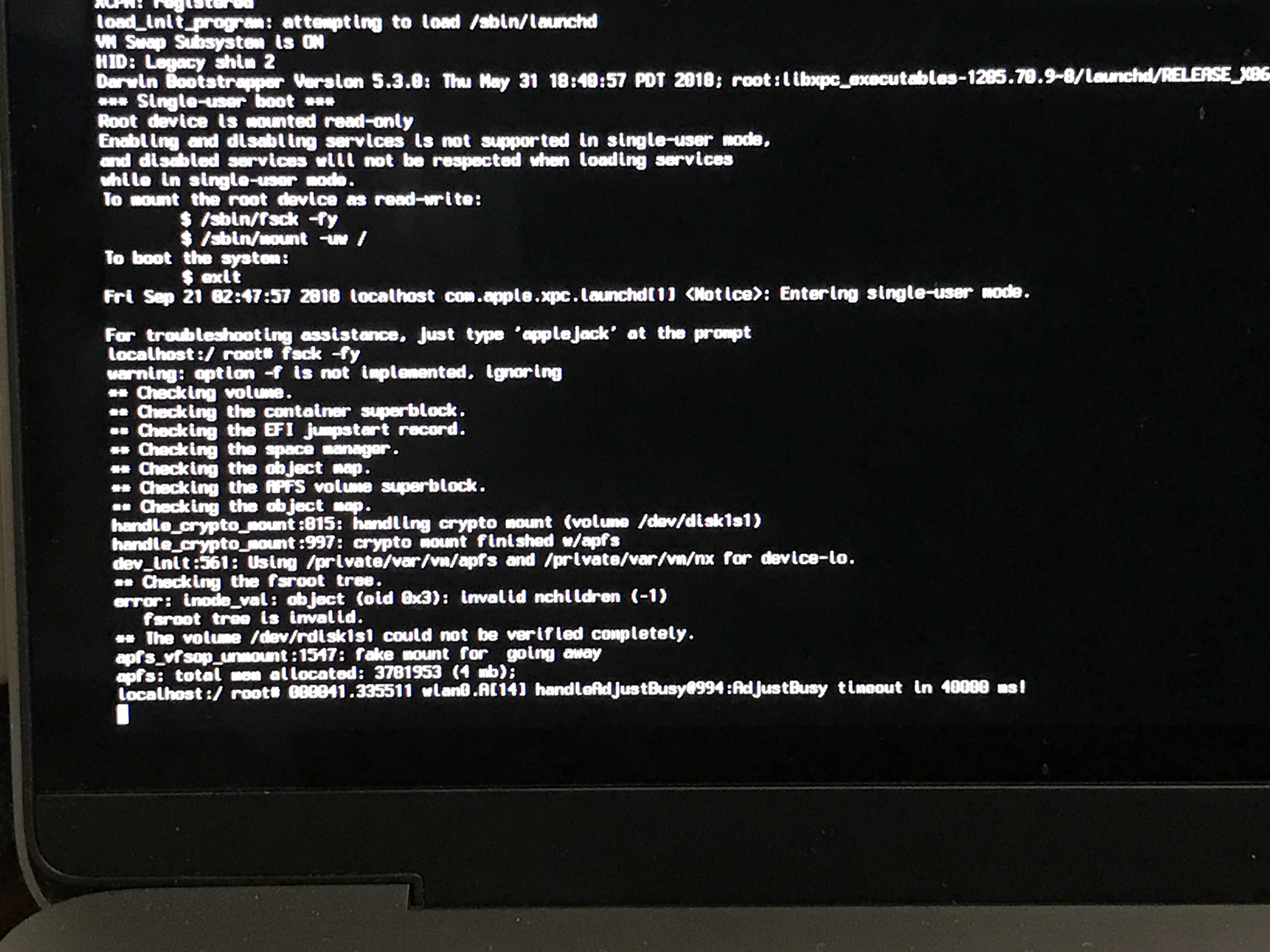 セーフモードでのfsck ーfyの結果です。この状態から5分以上経ってますが表示は変わらず、Enterキー押すとlocalhost :/ root# が表示されます。rebootで起動させると、またリンゴマークで不要な点滅があって最終的には起動します。購入して数日のお話しなので非常に気になるところです。