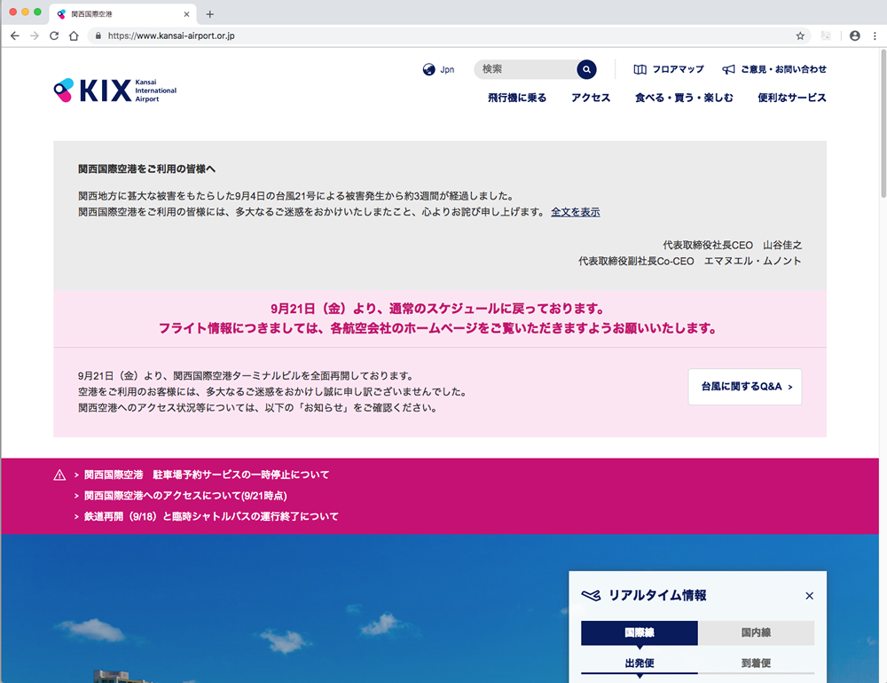 まず、関空のページですが、当方の Safari 12 では問題はありません。2枚目の画像 (Google Chrome のスクリーンショット?) と同様の表示となります。