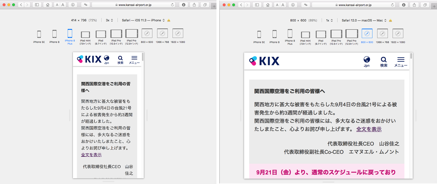 まず、関空のページですが、当方の Safari 12 では問題はありません。2枚目の画像 (Google Chrome のスクリーンショット?) と同様の表示となります。