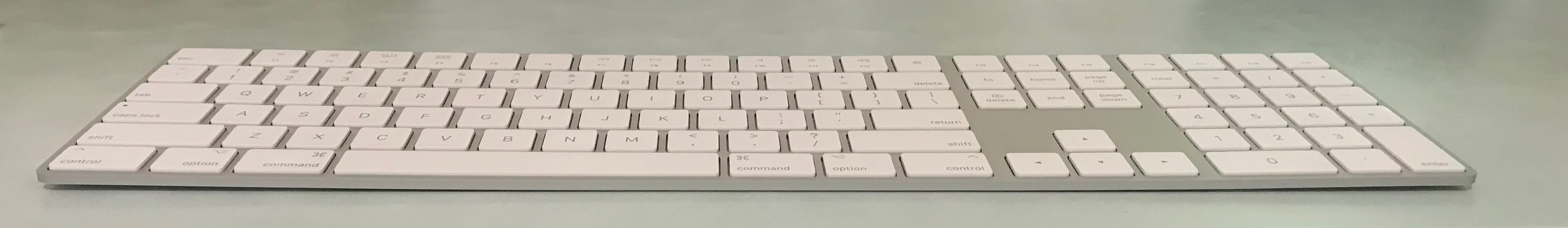 私は、2017年7月にMagic Keyboard(テンキー付き)を購入しましたが、2018年4月頃からキーボードの湾曲が顕著になってきました(下図、両端が反り上がっているのがわかると思います。)。 その為、1年間のハードウェア保証期間内でしたので、2018年5月に無償交換となりましたよ。 同様のトラブルについては、インターネットを検索するといくつかの事例が出てくると思います。
