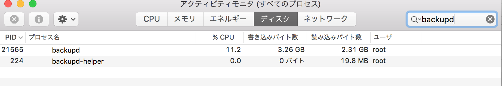 Time Machineでバックアップ中に、試しにiTunesで音楽を聞きながらアクティビティモニターを立ち上げてみたらbackupdは5~10%を示していました。