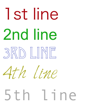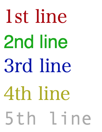 なお1行目の違いはデフォルトのフォントの違いと思われます。またfont-size、colorの指定はいずれの行も有効です。