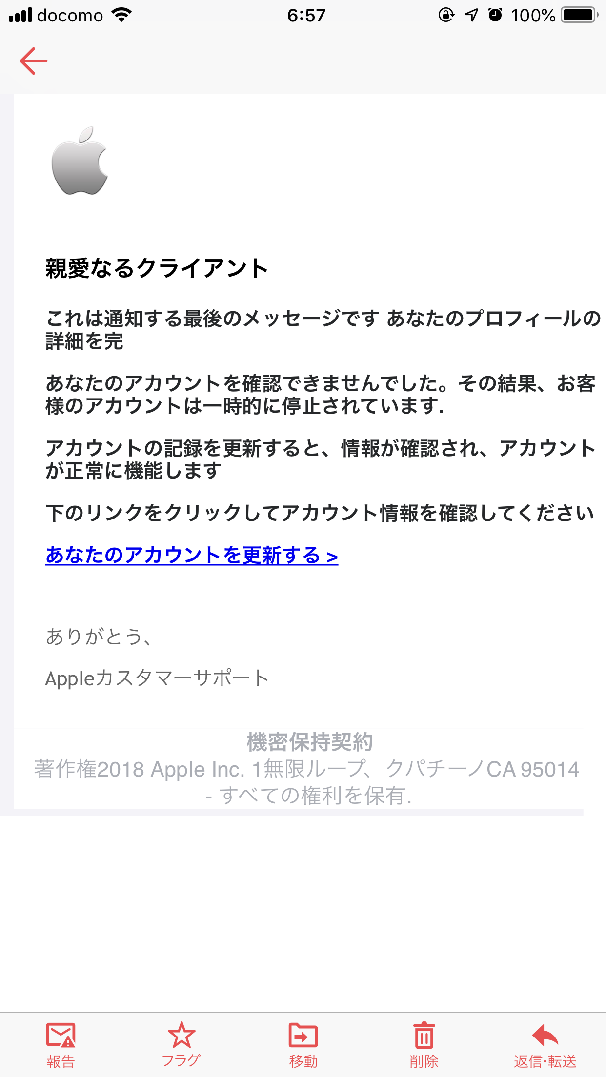 そこを通じて(じゃ無いかもしれませんが)AppleIDを盗むのが恐らくこのメールの送信元の狙いです。