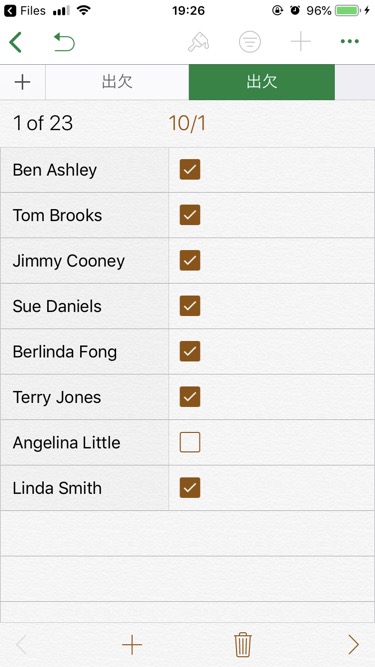 iPhone用のNumbers.appにはチェックボックスの機能がありますね。 特に、フォームのチェックボックスは便利そうです。 下図は『出欠』のテンプレートの表をフォームにしたものです。 → テキストおよび数字を入力する