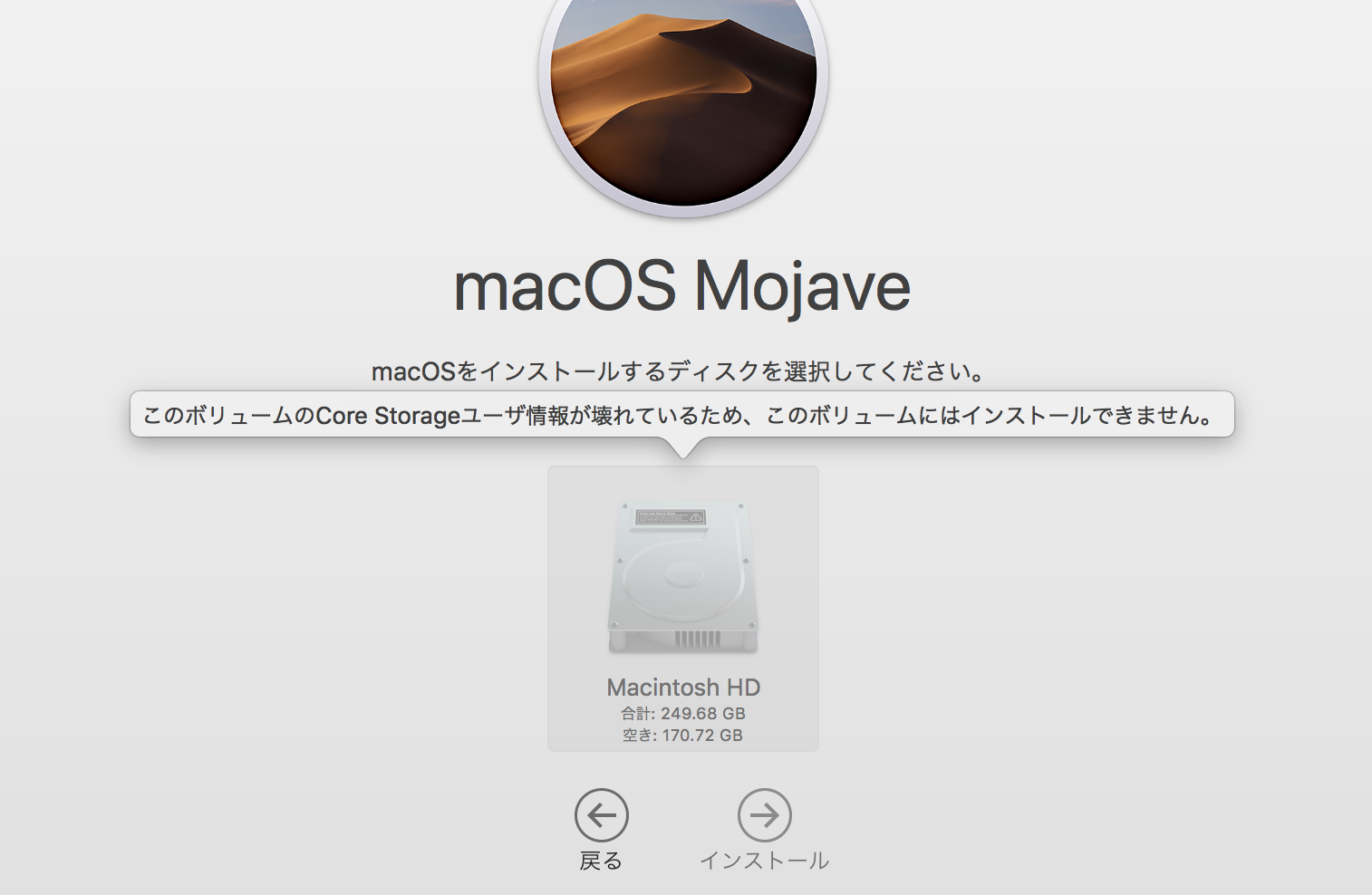 macOS MojaveのインストールがCore Storageユーザ情報が壊れていてできない