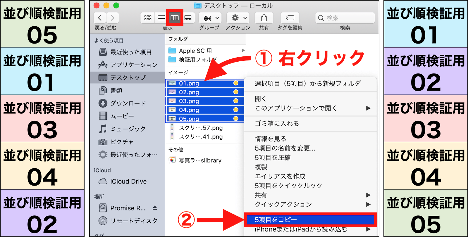 Finder上の並びが01~05の並びでもペーストすると05~01の並びになってしまいます。