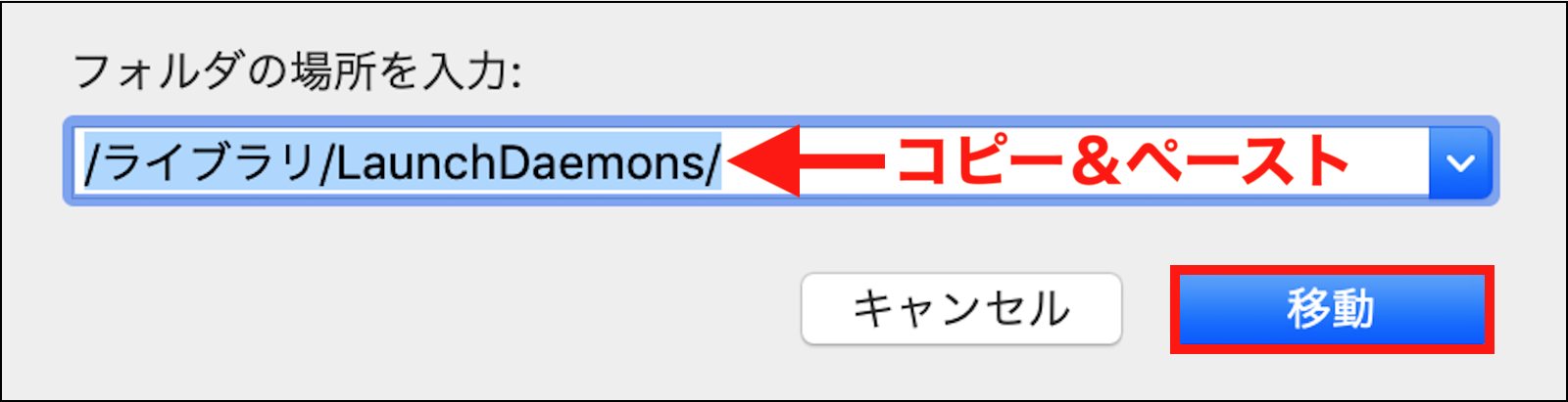 「Disk Drill.app」を削除済みであれば、「Finder」で「移動」メニュー >「フォルダへ移動」を選択すると表示される下の画像の様なプルダウンパネルの入力欄に、/ライブラリ/LaunchDaemons/ をコピー&ペーストして入力し、「移動」ボタンをクリックして移動後に、「LaunchDaemons」フォルダ内の「com.cleverfiles.cfbackd.plist」を、管理者パスワードを入力して「ゴミ箱」に入れます。