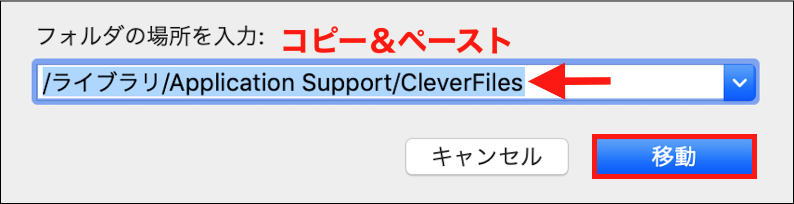 同様にして、「フォルダへ移動」のプルダウンパネルの入力欄に、/ライブラリ/Application Support/CleverFiles をコピー&ペーストして入力し、「移動」ボタンをクリックして移動後に、「CleverFiles」フォルダを管理者パスワードを入力して「ゴミ箱」に入れます。
