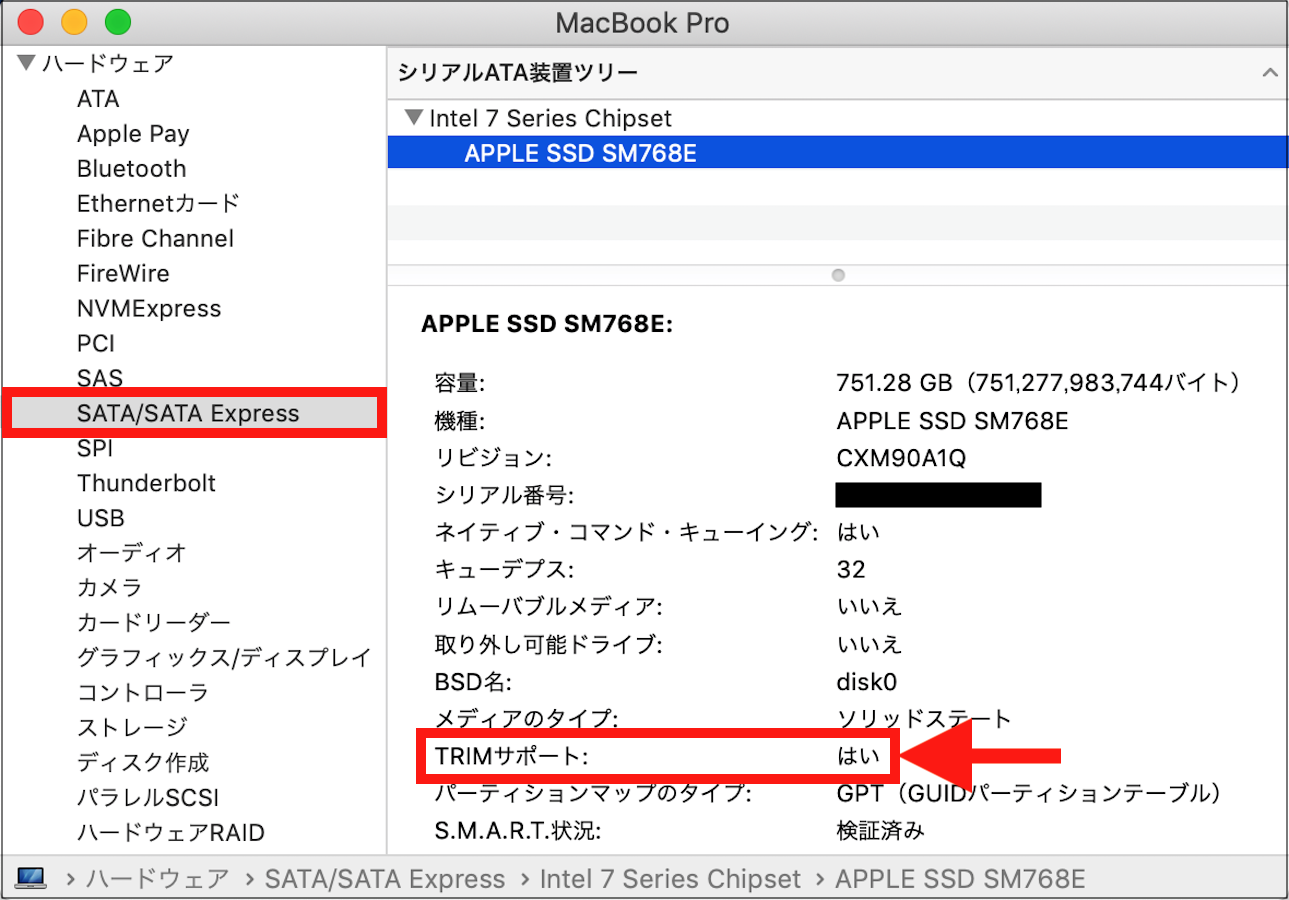 (例えば、私の MacBook Pro(Retina, 15-inch, Mid 2012)の場合は、「SATA/SATA Express」を選択すると、下の画像の様に「TRIM サポート」が「はい」と表示されます)