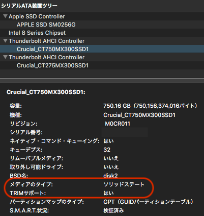 macOS Mojave(10.14.1)のシステムレポートでストレージの項目を見ても「TRIMサポート」が見当たりません。