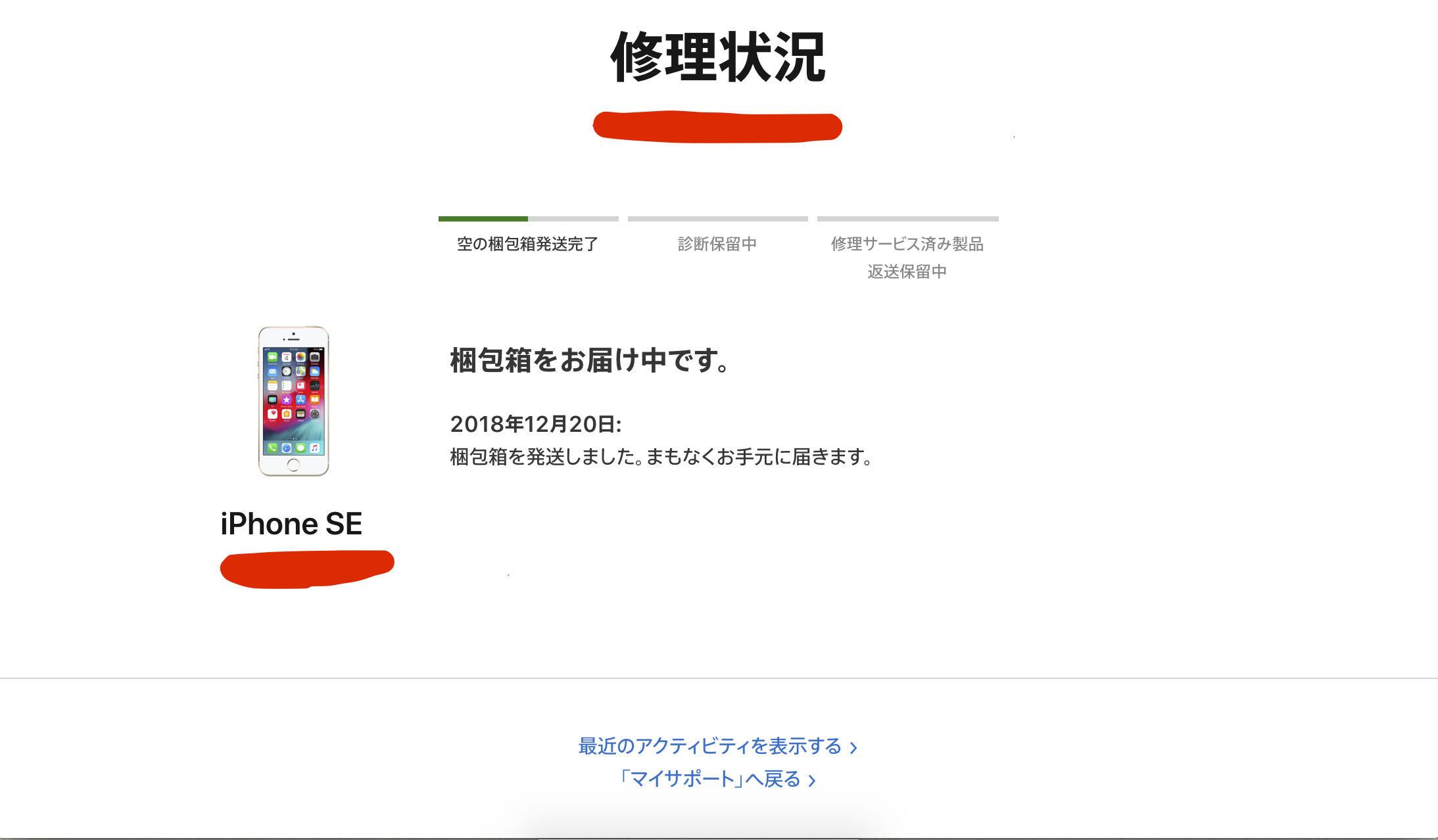 12月14日時点、マイサポート修理状況が梱包箱をお届け中のままは