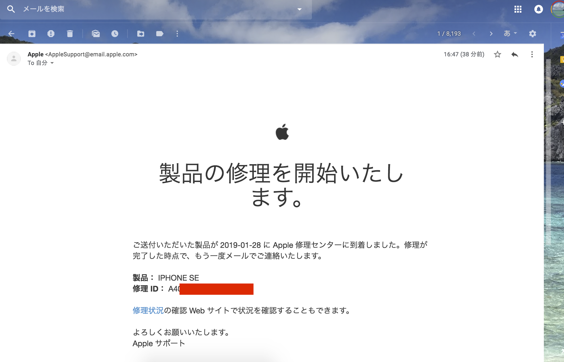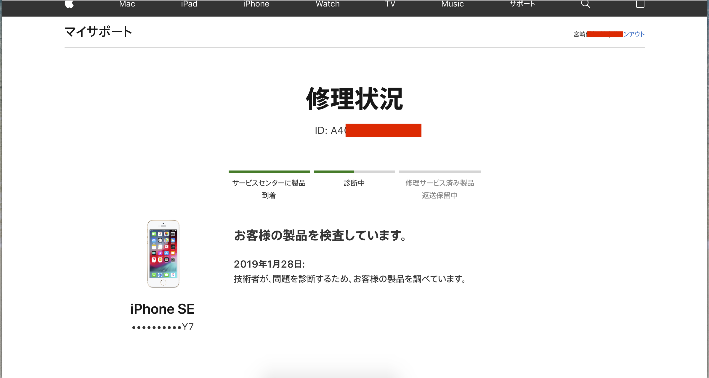 進捗チェックしたところ21日9時台に製品受領、16時台に修理完了 発送となっていました。
