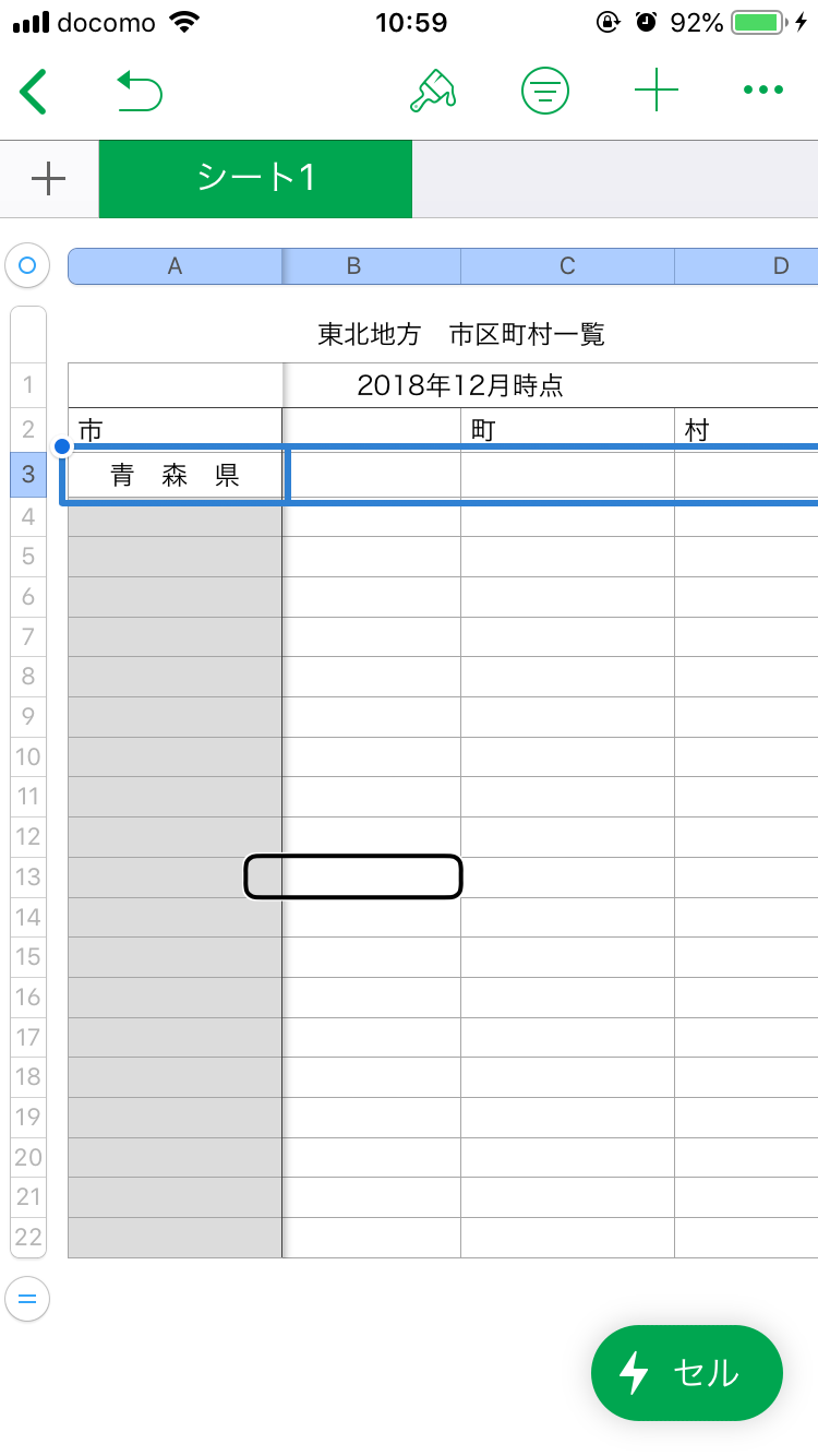 Numbersでセルを結合したくてセルを選択して、「セルのアクションメニュー」ボタンをタップするのですが、「セルを結合」の項目が表示されず、結合できない状態です。