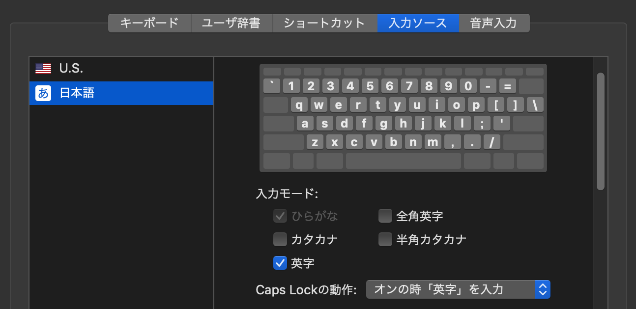 U.S.キーボード使用中で、入力ソースはABCと日本語です。
