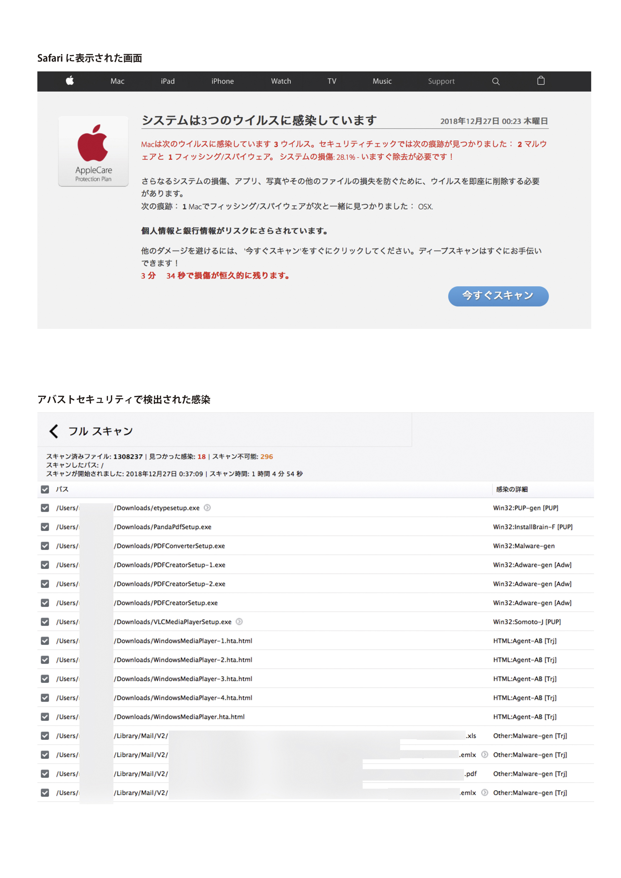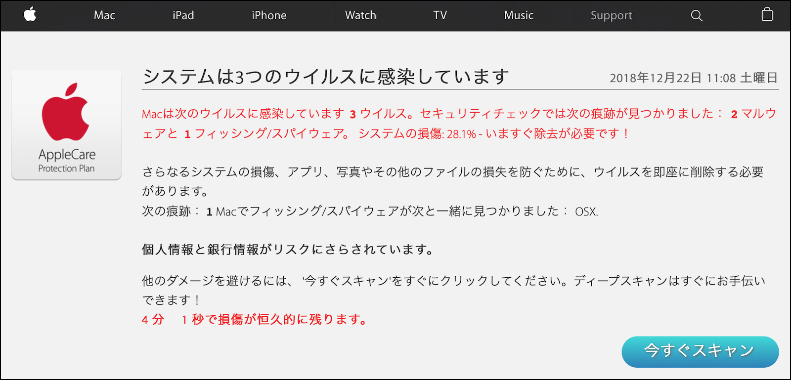 AppleCareが「システムは3つのウィルスに感染しています」としている表示が出ました。