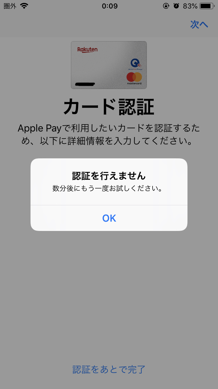 Apple Payにクレジットカードを登録するため、カード番号セキュリティコード等の記入を終え本人認証を終えましたが、「お使いのカードは認証を待っています」という表示が未だ出て使えません。認証を完了という青いボタンがあるのでタッチし進むと、「Apple Payで利用したいカードを認証するため、以下に詳細情報を入力してください」という表示が出ます。詳細情報を入力する為、次へを押しても、「認証を行えません 数分後にもう一度お試しください」と表示されるだけです。2週間この作業を繰り返し行っていますが、次へより先へいけません。カード会社に確認すると、本人認証も終えておりApple Payを利用できるように設定されているので原因が分からないそうです。Apple payが利用できず困っています。どうしたらいいのでしょうか?