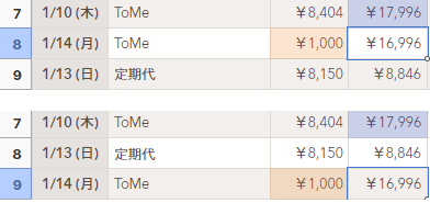 家計簿を作っているのですが、下図(上)のように日付を前後させて入力させた後、日付順に並び替えると、下図(下)のように、直前の行の値を参照しなくなってしまいます。